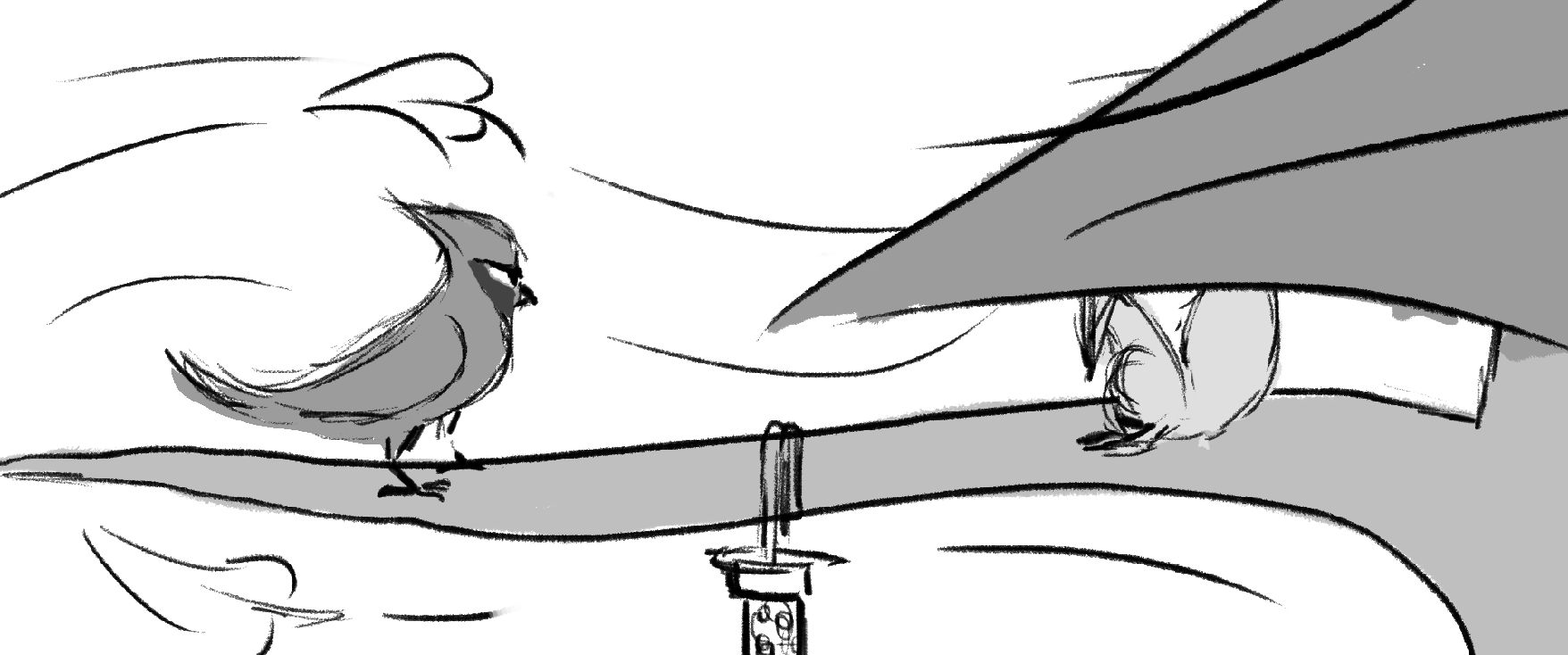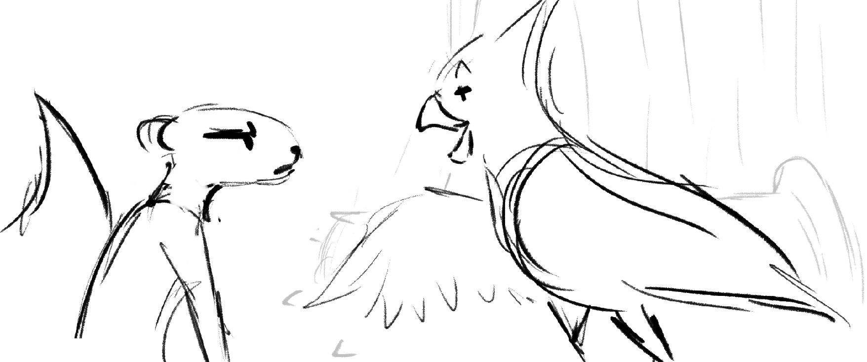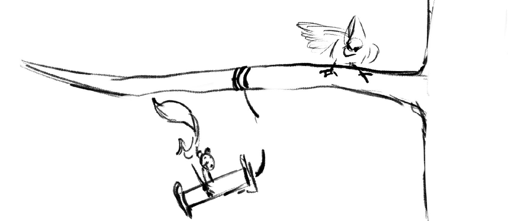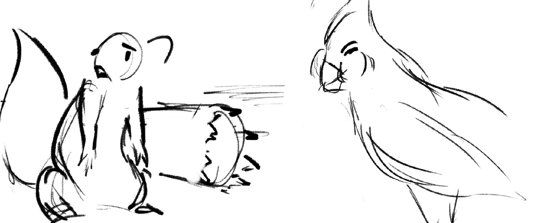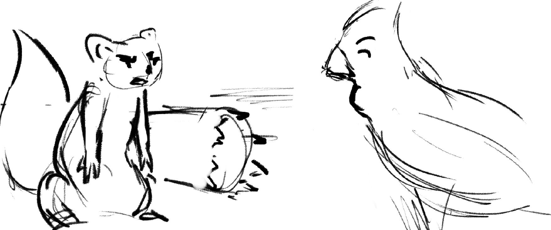 A squirrel has a showdown against a Cardinal to see who will claim the birdfeeder as their own.