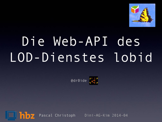 also ran an die Daten ! - Laden der Daten, die mit „Völkerkunde“ verschlagwortet sind: $ wget http://lobid.org/resource?subject=4078931-7&from=0&size=100 - Erhöhe den Parameter „from“ zum Durchblättern der Ergebnismenge Pascal Christoph Dini-AG-Kim 2014-04