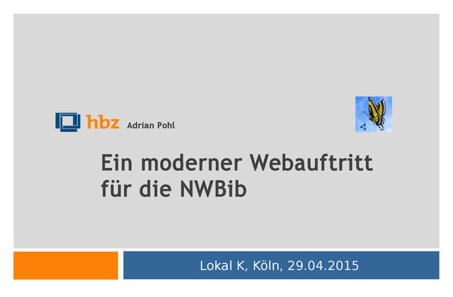 und HTML- Version Seit 2002: gesamte NWBib als Bestandteil des hbz- Verbundkatalogs Anfang 2013: Auftrag zur Überarbeitung des Webauftritts Anfang 2014: Beginn der Entwicklung des neuen Webauftritts Ein moderner Webauftritt für die NWBib