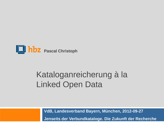 2012-09-27 Dieser Vortrag – inklusive der durch den Autor erstellten Grafiken auf den Folien 7, 8, 11, 13, 15, 16, 17, 18, 20, 21, 33, 62, 63 und 67 – steht unter der CC0 Lizenz : https://creativecommons.org/about/cc0 Davon ausgenommen sind die übrigen verwendeten Grafiken, Bilder und Screenshots, deren individuelle Rechte und Lizenzbedingungen fortgelten. Insbesondere stehen die http://www.istockphoto.com/ Grafiken auf den Folien 47, 49, 50 und 83 unter einer CC-BY-ND Lizenz : http://creativecommons.org/licenses/by-nd/3.0/de/ Die Graphiken auf den Folien 22-26 entstammen dem “Linking Open Data cloud diagram, by Richard Cyganiak and Anja Jentzsch. http://lod-cloud.net/”