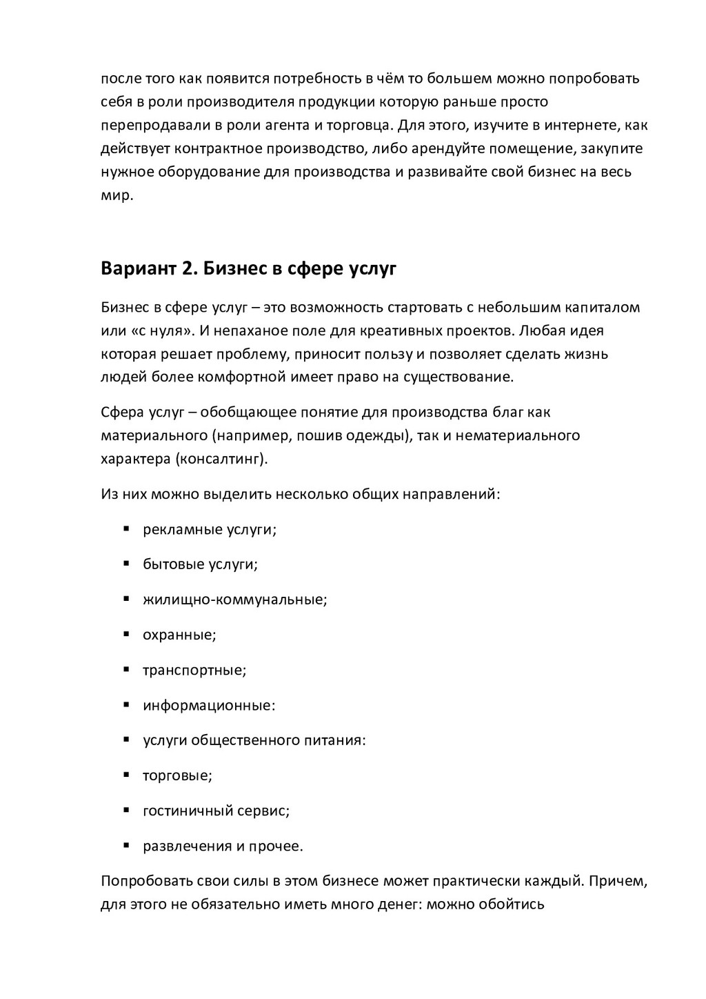 Выясните, кто как работает: цены, сроки, технологии, гарантии. Шаг 3. Проведите рекламную кампанию. Объявления в местных газетах, визитки, баннеры в интернете, билборды и лайт-боксы… Словом, используйте все, на что хватит средств и что поможет привлечь внимание к вашей деятельности. Запомните: нет рекламы – нет клиентов. Шаг 4. Начните с благотворительности. В смысле, не бойтесь оказать услугу просто так, бесплатно. «Сарафанное радио» остается одним из самых мощных двигателей бизнеса. Беритесь за любую, даже самую незначительную работу, ведь хорошая репутация – это тоже капитал. Шаг 5. Всегда будьте вежливы, выполняйте взятые обязательства в срок и в полном объеме. Среди наемных работников нет ни одного миллионера! Если, оценив возможные риски, вы приняли решение заняться организацией бизнеса в сфере услуг — вы уже сделали первый шаг к успеху. Стартуя «с нуля», непросто попасть на обложку «Forbes», но зато каждый новый уровень даст вам энергию для движения вперед. Вариант 3. Начать с малого Если Вы умеете что то хорошо делать и Вам это нравится, начните бизнес с малого и постепенно масштабируйтесь. Умеете готовить вкусные десерты? Сделайте пробную партию, прайс и договоритесь с небольшими магазинами, начините поставлять им кондитерские изделия на заказ. С каждым разом реинвестируйте полученный доход от продажи в свой бизнес и производите больше продукции, лучше. Умеете работать с металлом, деревом или другим сырьем? Разместите объявления о продаже деревянных кроватей, конструкций из металла, далее возьмите заказ и предоплату, сделайте заказанное изделие клиентом, получите полную оплату. Постепенно наращивайте обороты бизнеса увеличивая ассортимент производимых товаров, качество, точки сбыта.