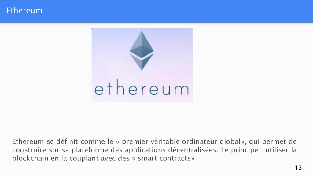 ordinateur global», qui permet de construire sur sa plateforme des applications décentralisées. Le principe : utiliser la blockchain en la couplant avec des « smart contracts»