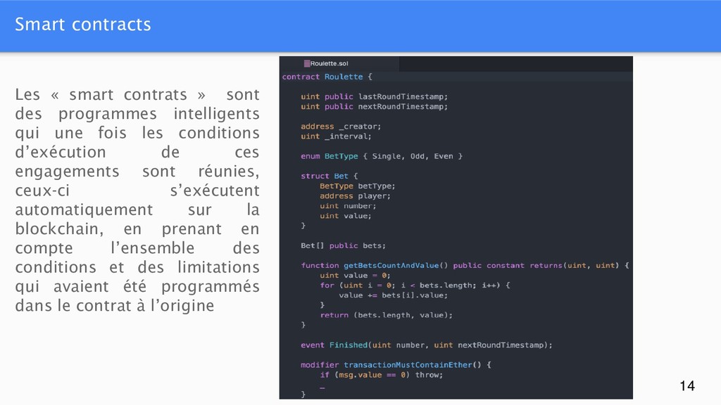programmes intelligents qui une fois les conditions d’exécution de ces engagements sont réunies, ceux-ci s’exécutent automatiquement sur la blockchain, en prenant en compte l’ensemble des conditions et des limitations qui avaient été programmés dans le contrat à l’origine