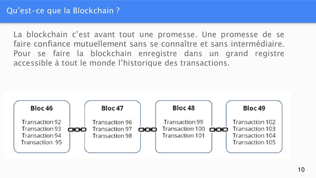 tout une promesse. Une promesse de se faire confiance mutuellement sans se connaître et sans intermédiaire. Pour se faire la blockchain enregistre dans un grand registre accessible à tout le monde l’historique des transactions.