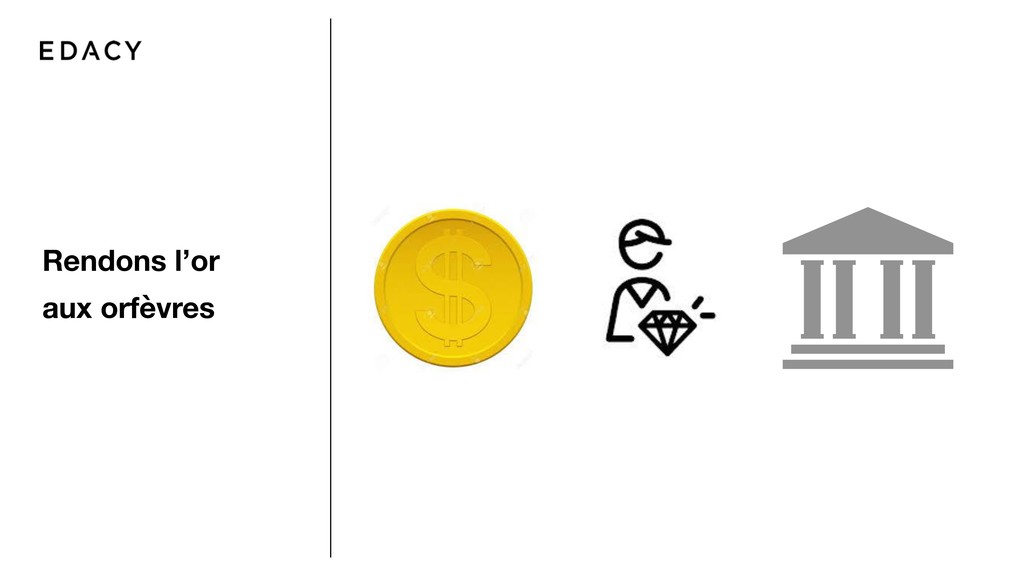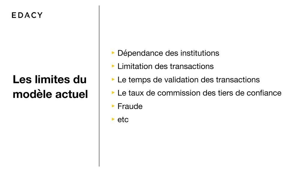 limites du modèle actuel ‣2008: le grand bon en avant Comment fonctionne le Bitcoin ? ‣P2P Network / Hash / Signature électronique ‣Les chaînes de blocs / Arbre de Merkle ‣La Blockchain ‣Les mineurs ‣Les propriétés ACD/BASE Let’s code Blockchain for business : Ethereum