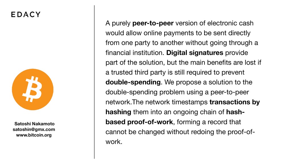 payments to be sent directly from one party to another without going through a financial institution. Digital signatures provide part of the solution, but the main benefits are lost if a trusted third party is still required to prevent double-spending. We propose a solution to the double-spending problem using a peer-to-peer network.The network timestamps transactions by hashing them into an ongoing chain of hash- based proof-of-work, forming a record that cannot be changed without redoing the proof-of- work. Satoshi Nakamoto [email protected] www.bitcoin.org