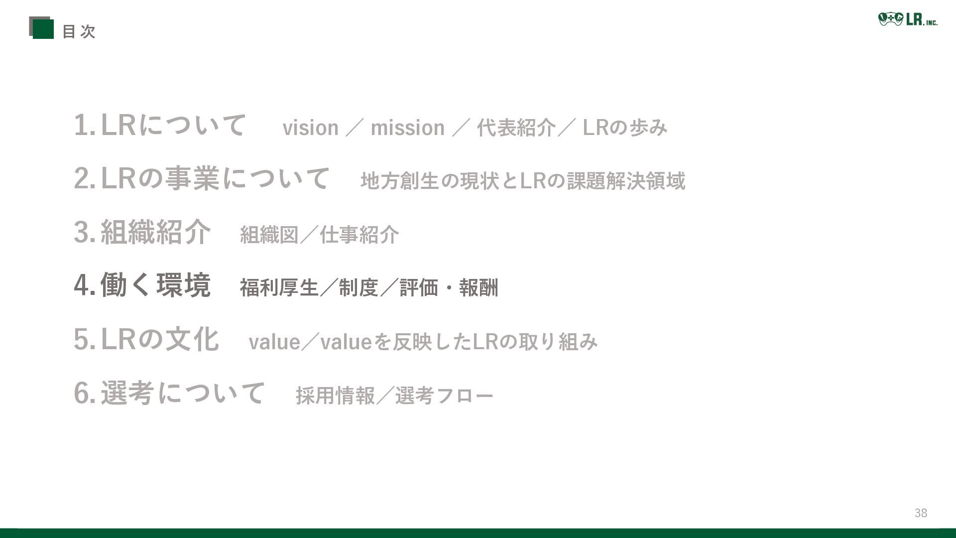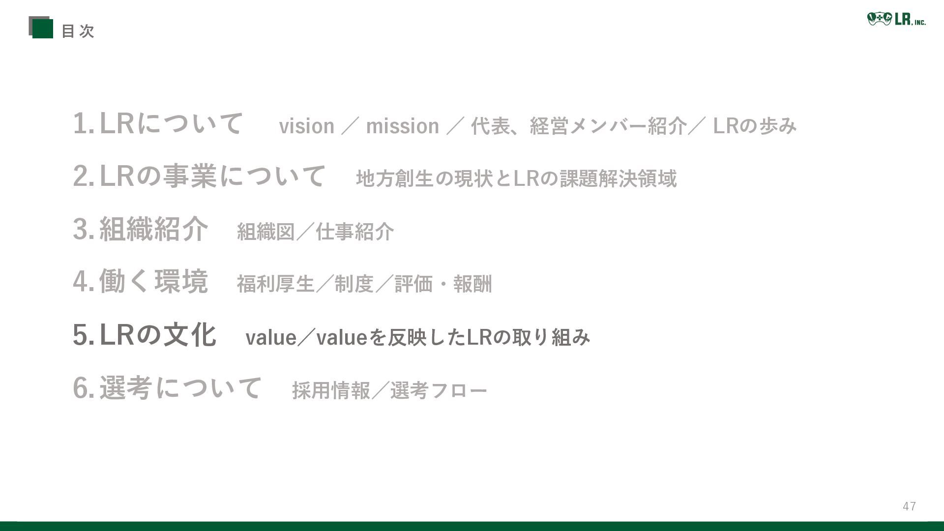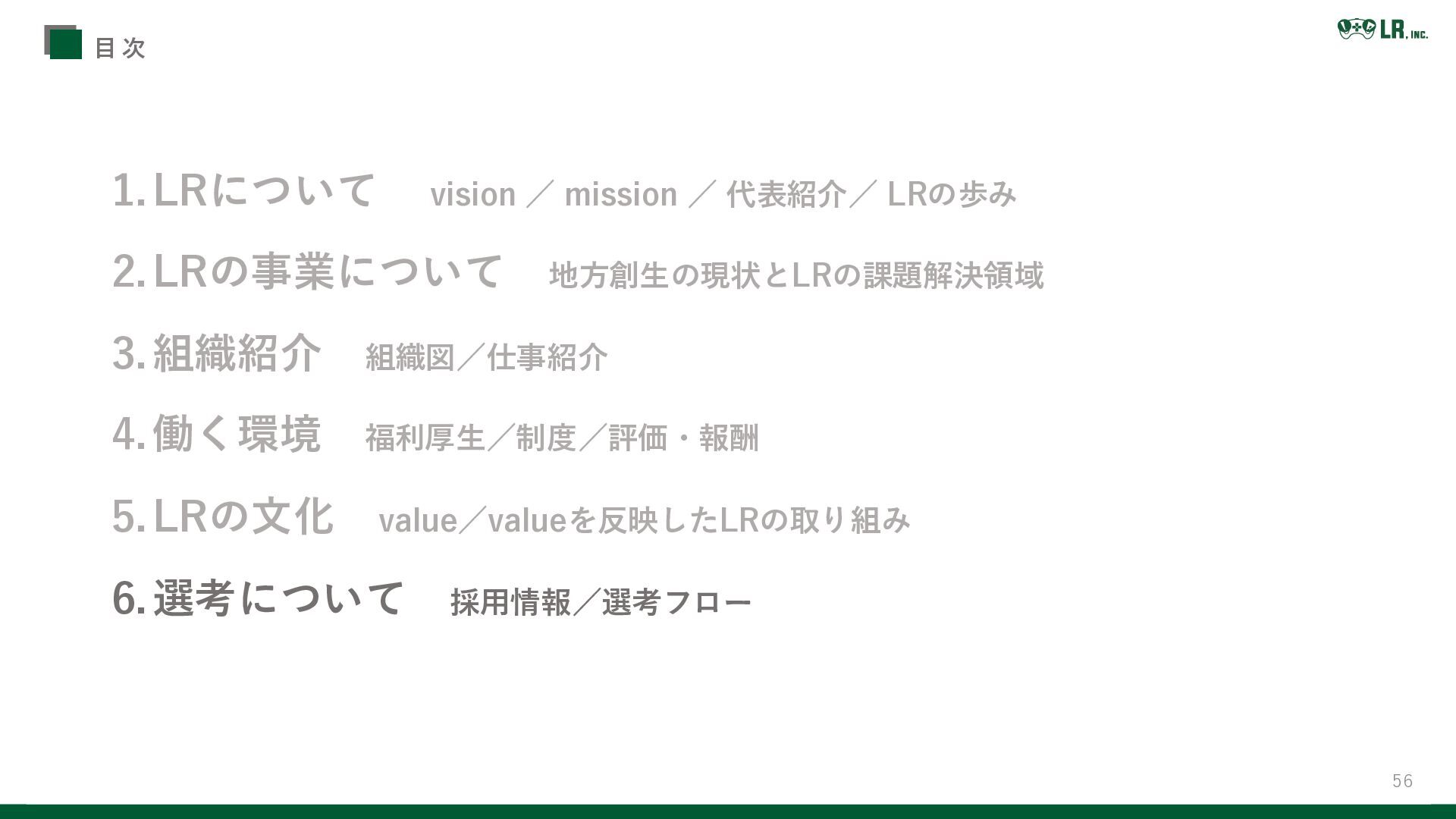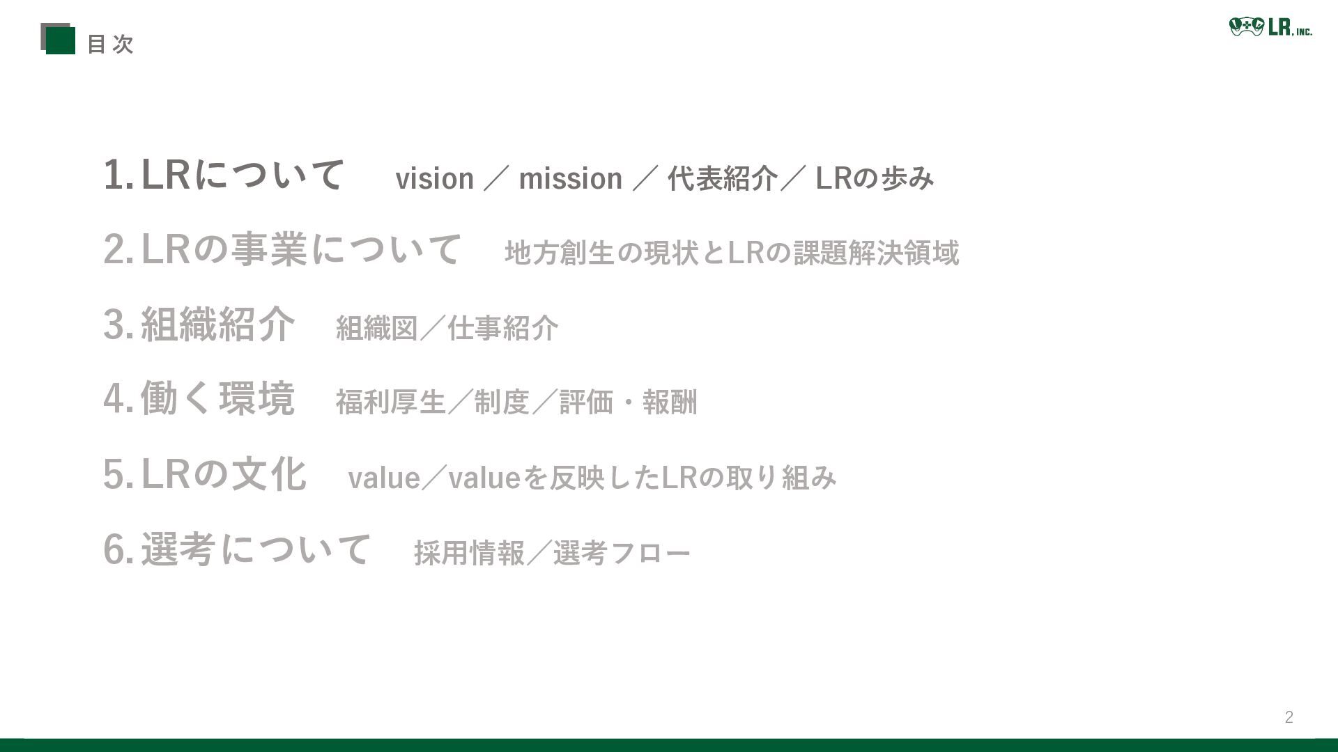 3.組織紹介 組織図/仕事紹介 4.働く環境 福利厚生/制度/評価・報酬 5.LRの文化 value/valueを反映したLRの取り組み 6.選考について 採用情報/選考フロー 目 次