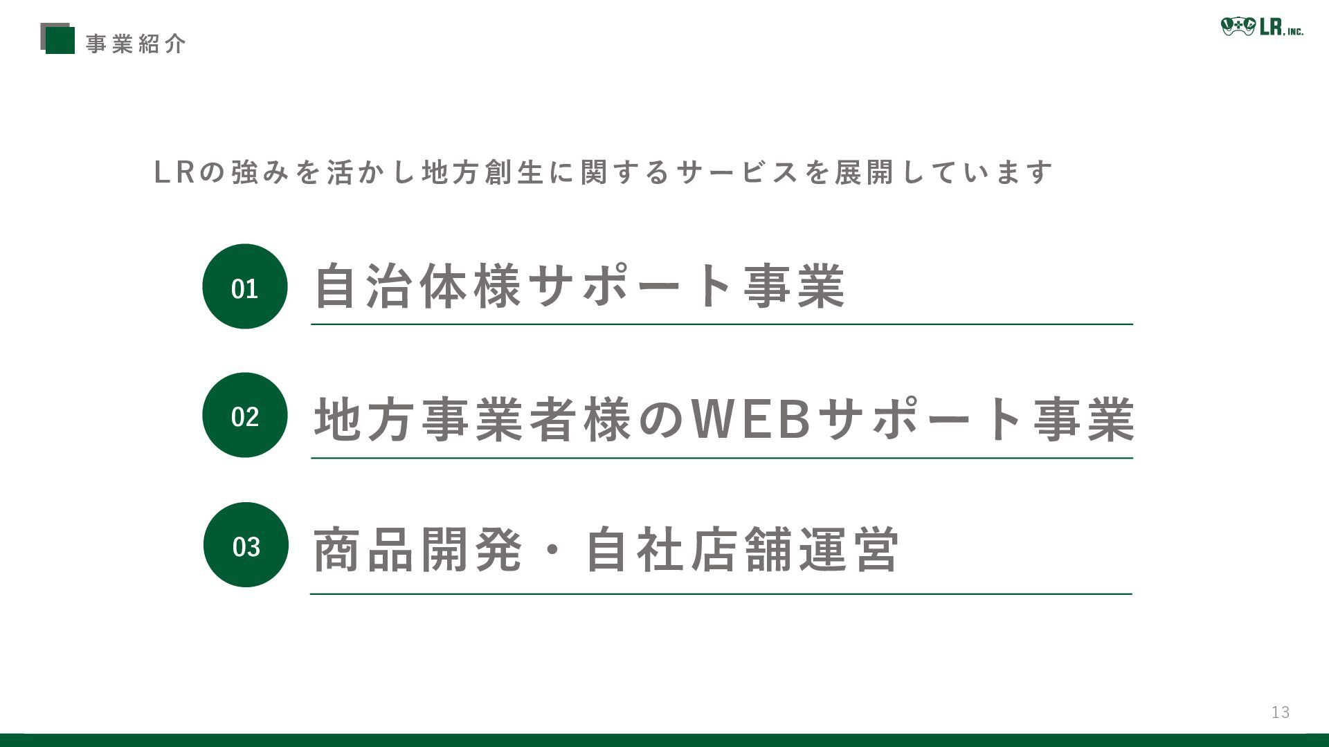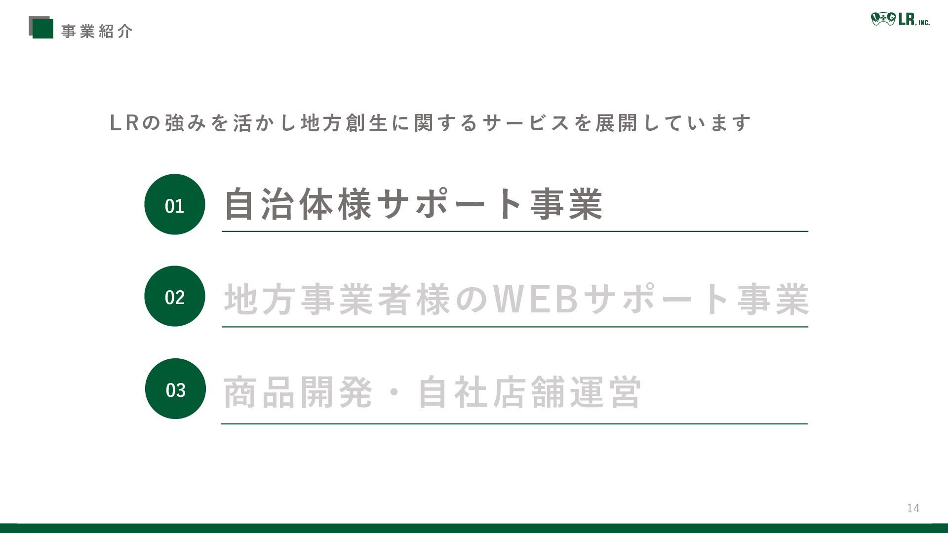 13 L Rの強みを活かし地方創生に関するサービスを展開しています 地方事業者様のWEBサポート事業 商品開発・自社店舗運営 自治体様サポート事業 01 02 03 事