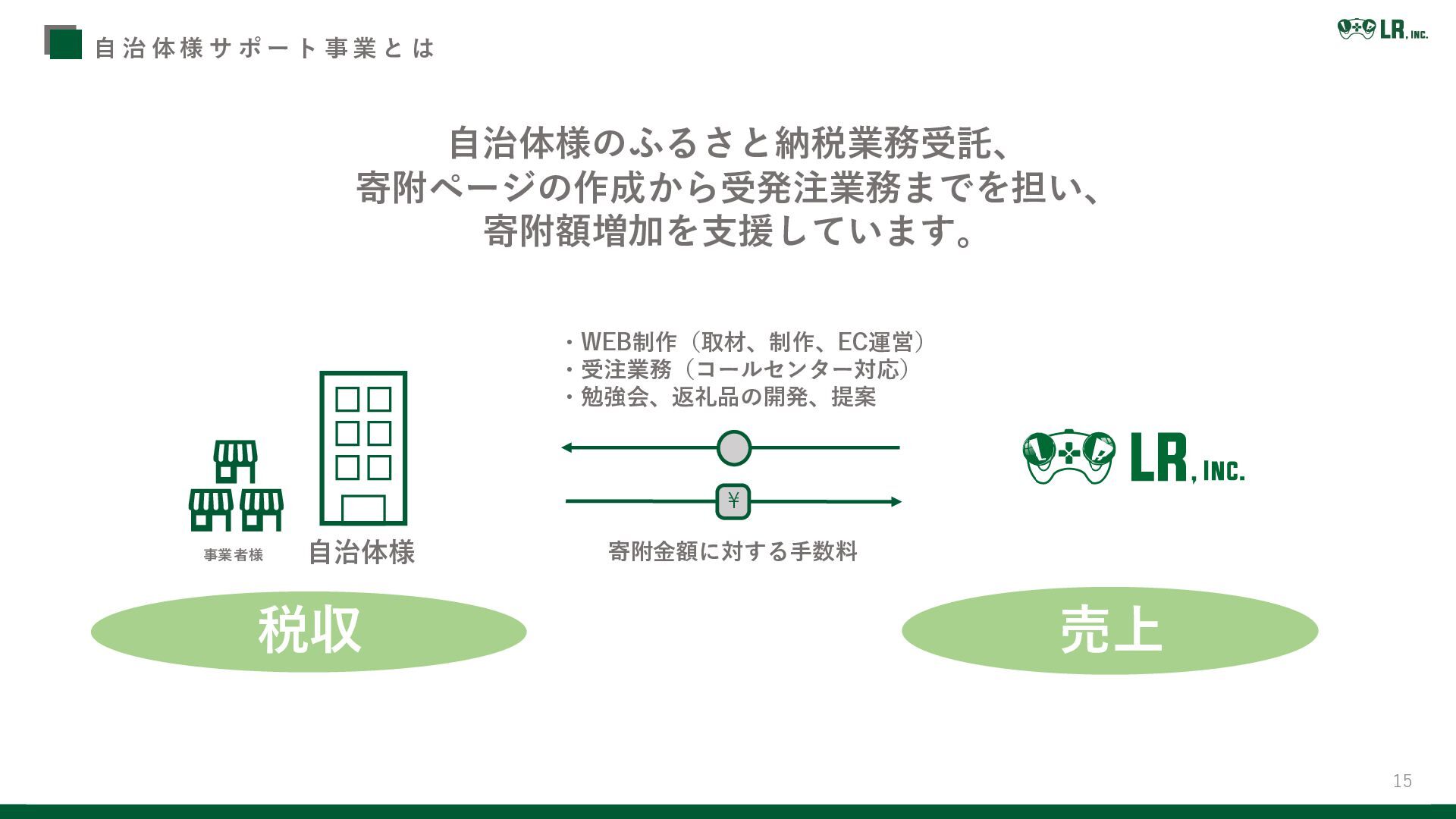 14 事 業 紹 介 L Rの強みを活かし地方創生に関するサービスを展開しています 地方事業者様のWEBサポート事業 商品開発・自社店舗運営 自治体様サポート事業