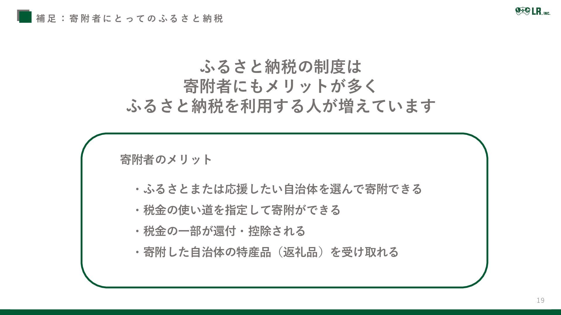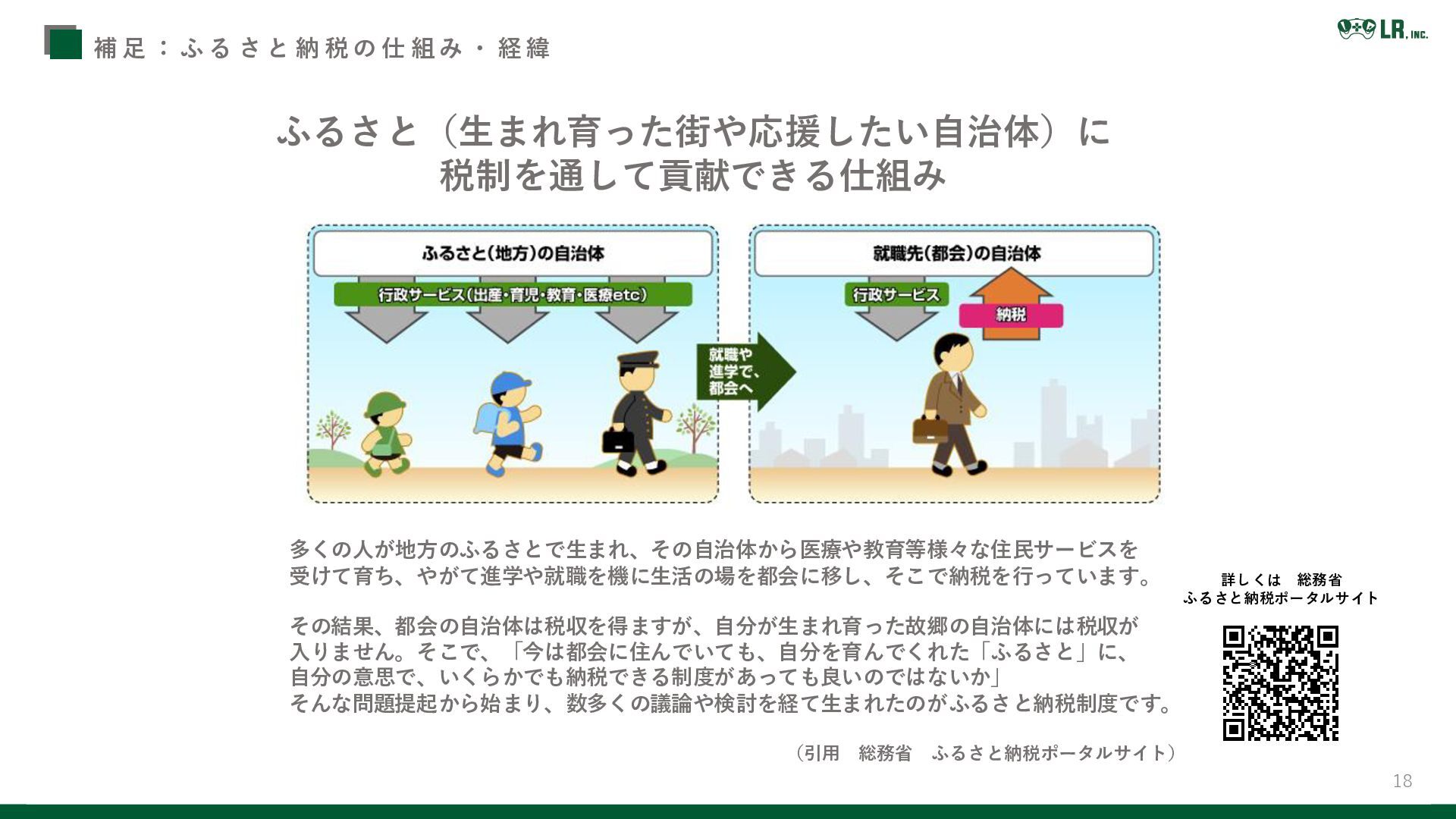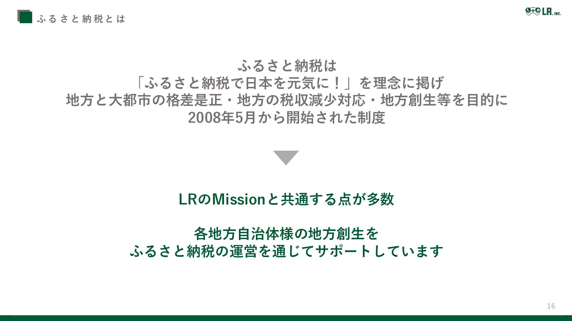 「ふるさと納税で日本を元気に!」を理念に掲げ 地方と大都市の格差是正・地方の税収減少対応・地方創生等を目的に 2008年5月から開始された制度 LRのMissionと共通する点が多数 各地方自治体様の地方創生を ふるさと納税の運営を通じてサポートしています