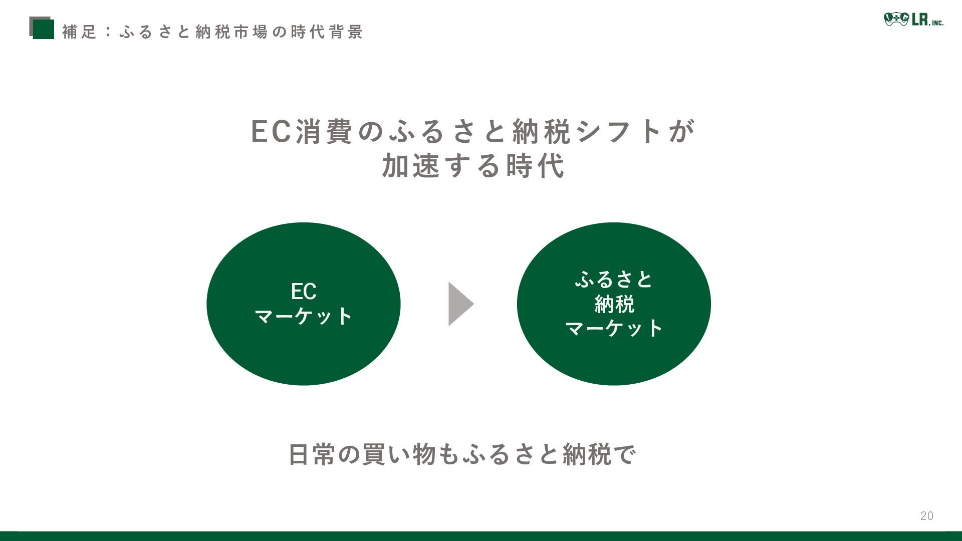 市 場 の 時 代 背 景 EC マーケット ふるさと 納税 マーケット EC消費のふるさと納税シフトが 加速する時代 日常の買い物もふるさと納税で