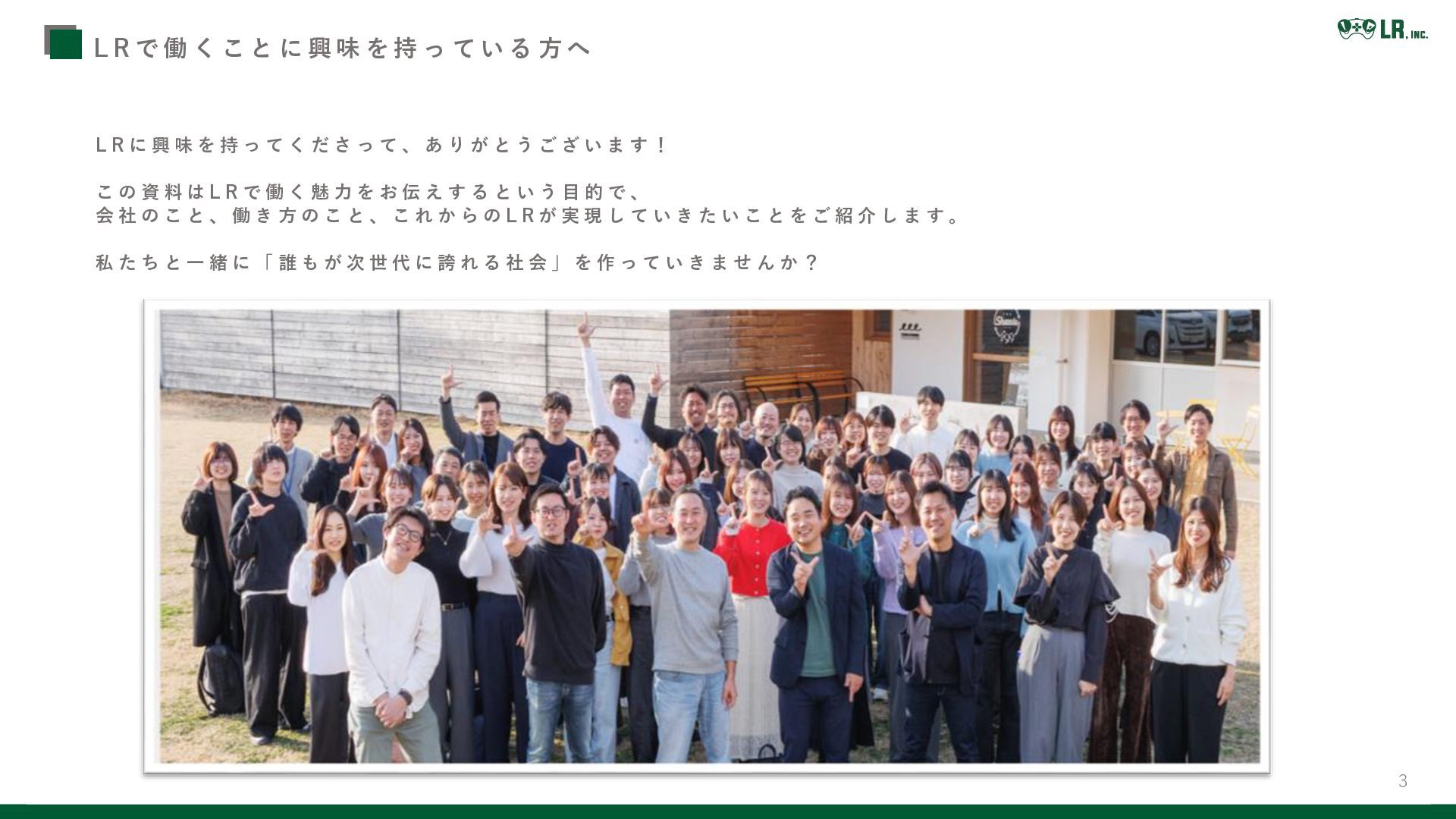く だ さ っ て 、 あ り が と う ご ざ い ま す ! こ の 資 料 は L R で 働 く 魅 力 を お 伝 え す る と い う 目 的 で 、 会 社 の こ と 、 働 き 方 の こ と 、 こ れ か ら の L R が 実 現 し て い き た い こ と を ご 紹 介 し ま す 。 私 た ち と 一 緒 に 「 誰 も が 次 世 代 に 誇 れ る 社 会 」 を 作 っ て い き ま せ ん か ? L R で 働 く こ と に 興 味 を 持 っ て い る 方 へ