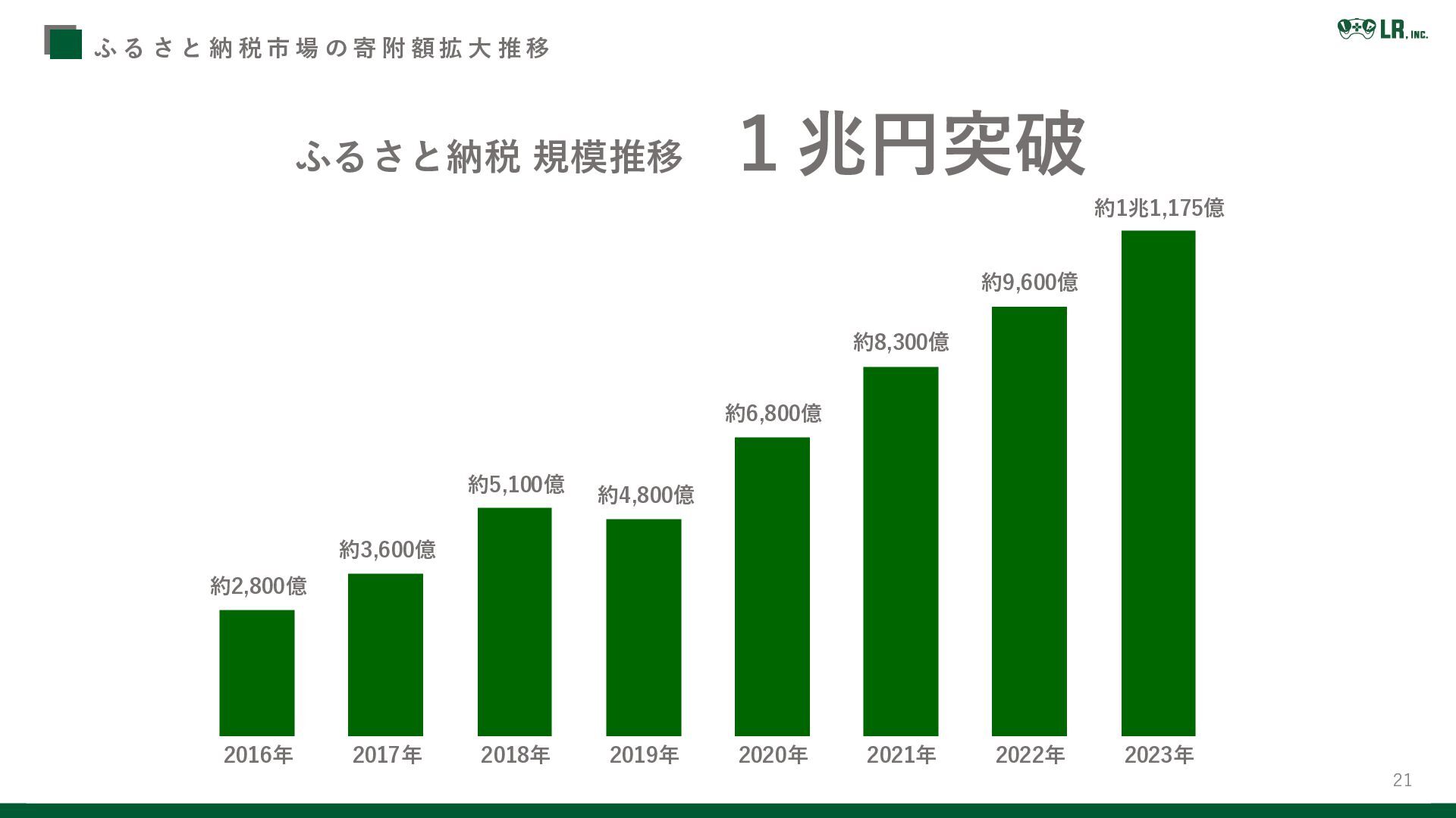 約1兆1,175億 約9,600億 約8,300億 約6,800億 約4,800億 約5,100億 約2,800億 約3,600億 ふ る さ と 納 税 市 場 の 寄 附 額 拡 大 推 移 ふるさと納税 規模推移 1兆円突破