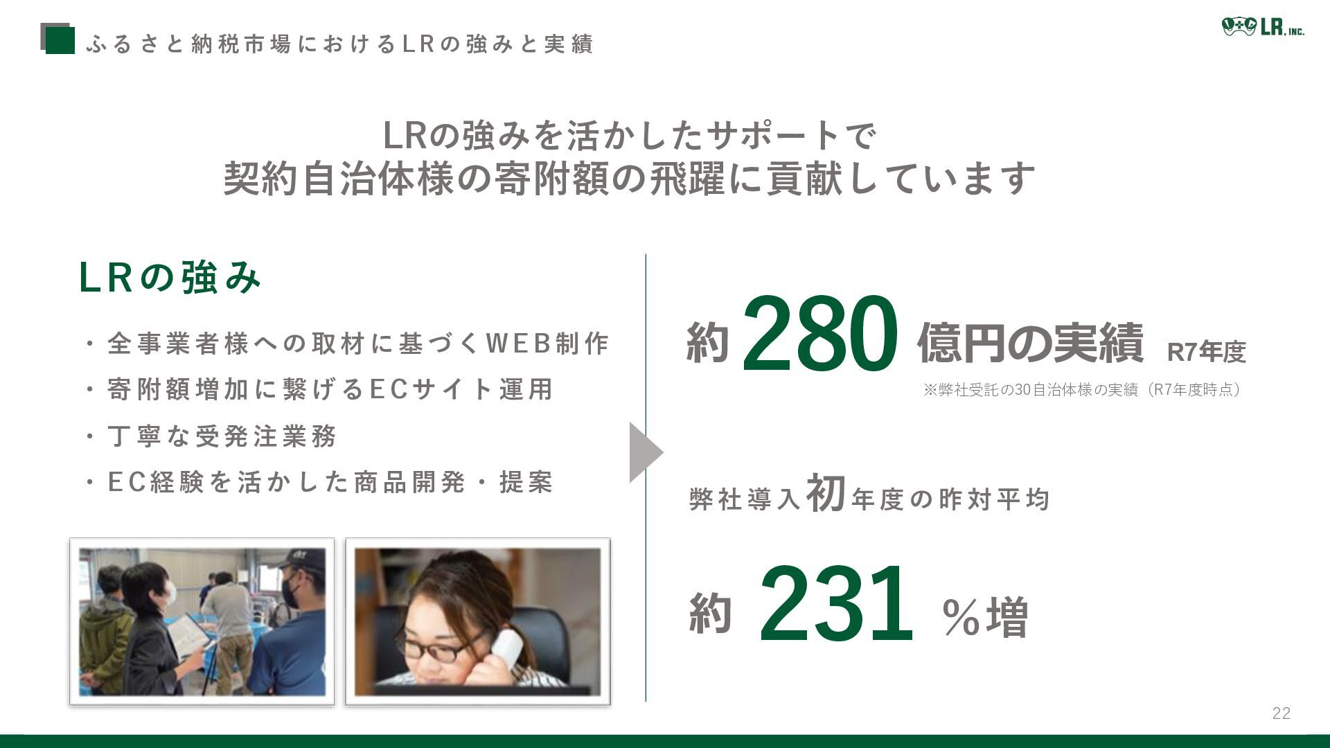 初年 度 の 昨 対 平 均 ※弊社受託の30自治体様の実績(R7年度時点) 280 231 LRの強み ・ 全 事 業 者 様 へ の 取 材 に 基 づ く W E B制 作 ・ 寄 附 額 増 加 に 繋 げ る E Cサ イ ト 運 用 ・ 丁 寧 な 受 発 注 業 務 ・ E C経 験 を 活 か し た 商 品 開 発 ・ 提 案 ふ る さ と 納 税 市 場 に お け る L R の 強 み と 実 績 LRの強みを活かしたサポートで 契約自治体様の寄附額の飛躍に貢献しています
