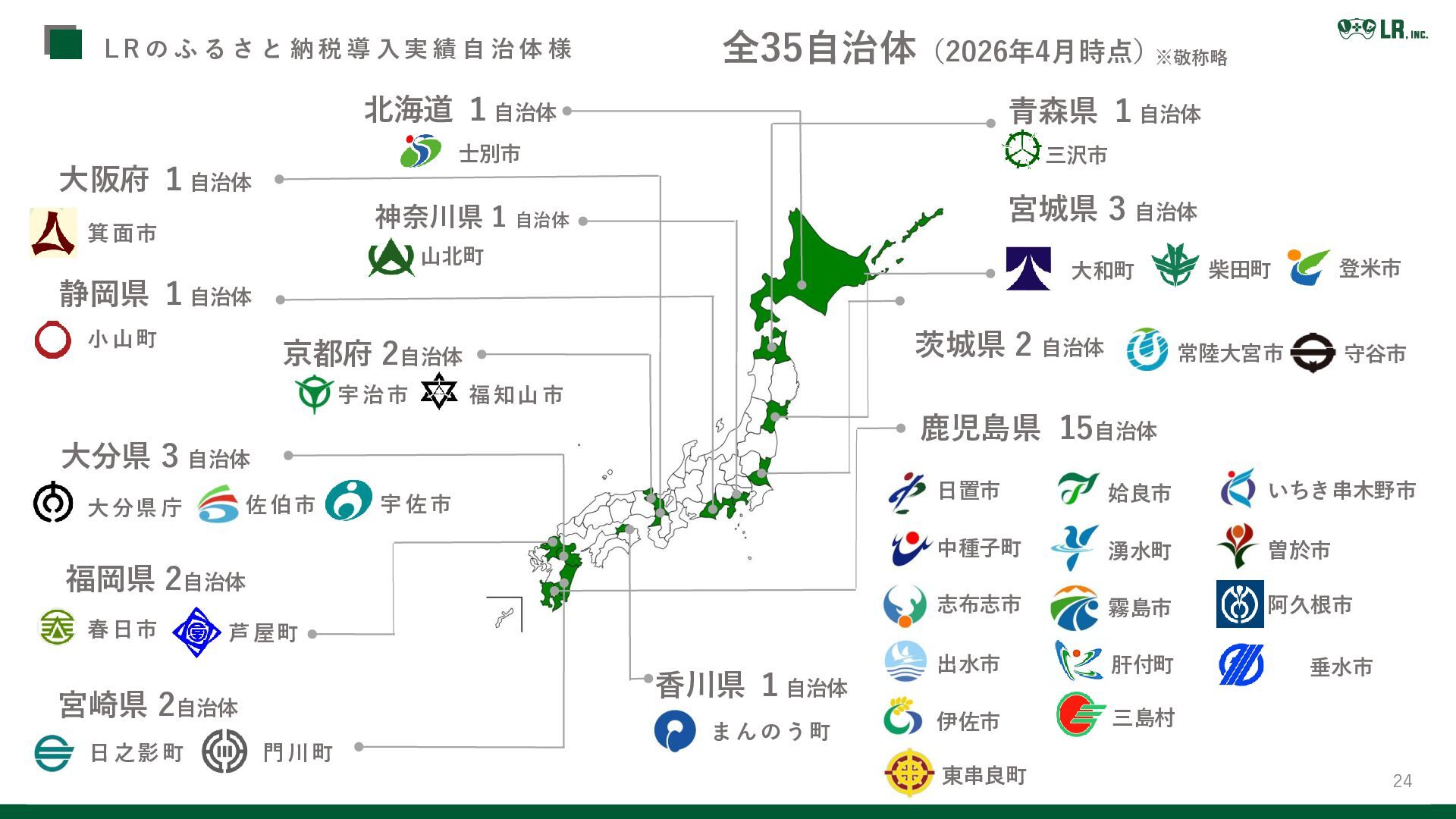 大阪府 1自治体 佐 伯市 湧水町 日置市 姶良市 阿久根市 いちき串木野市 出水市 伊佐市 曽於市 中種子町 霧島市 志布志市 肝付町 門 川町 日 之影 町 大和町 宮城県 3 自治体 香川県 1自治体 ま んの う 町 箕 面市 全35自治体(2026年4月時点) ※敬称略 福岡県 2自治体 春 日市 垂水市 宇 佐市 大 分県 庁 北海道 1自治体 士別市 柴田町 L R の ふ る さ と 納 税 導 入 実 績 自 治 体 様 芦 屋町 登米市 京都府 2自治体 茨城県 2 自治体 宇 治市 常陸大宮市 三島村 小 山町 静岡県 1自治体 福 知山 市 守谷市 神奈川県 1 自治体 山北町 青森県 1自治体 三沢市