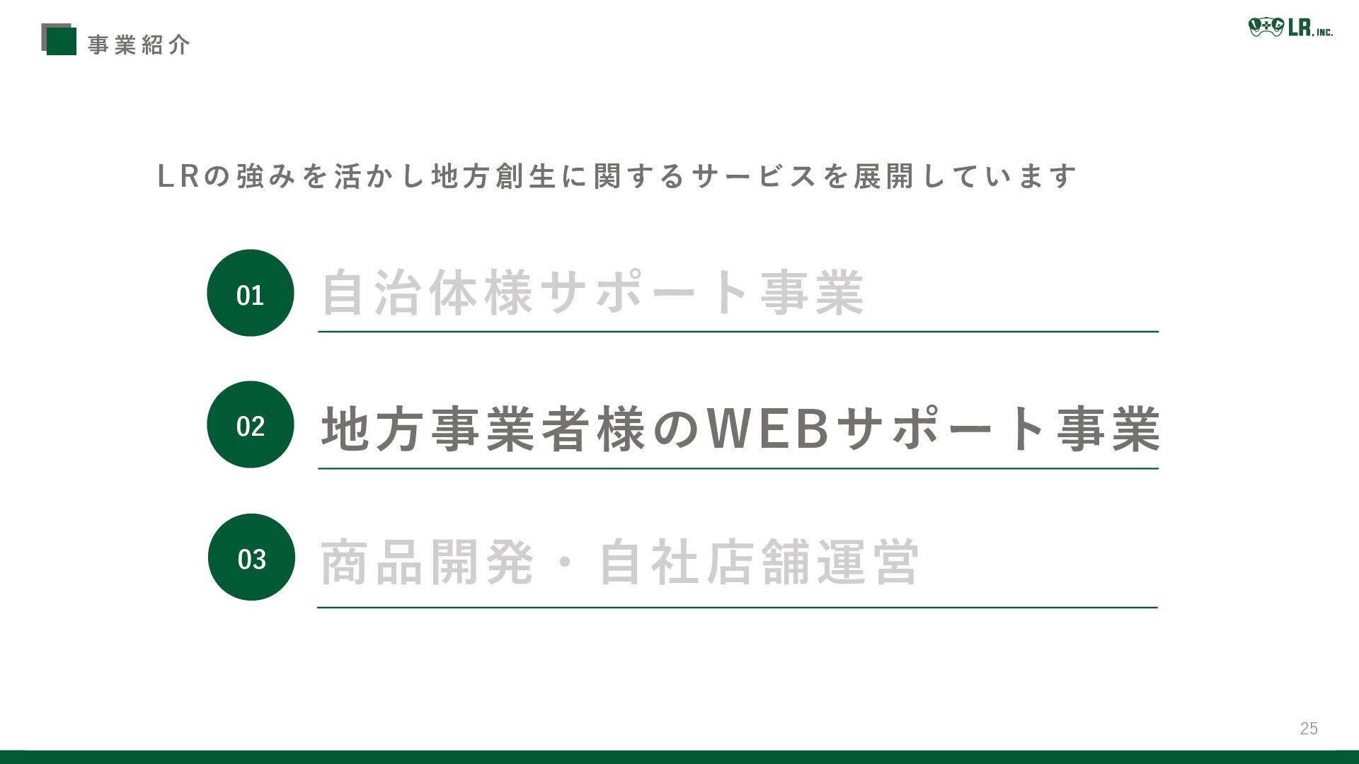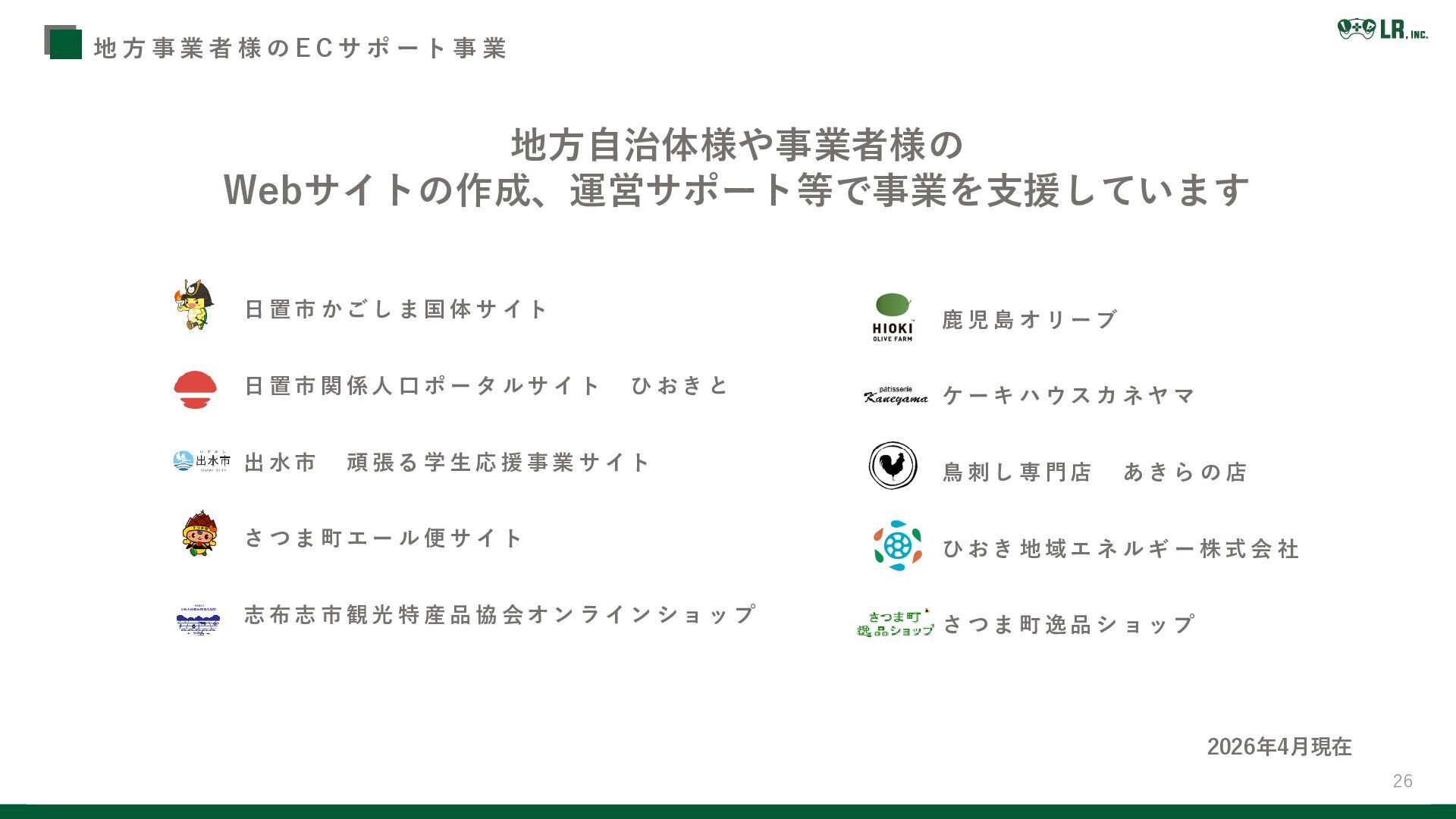 25 L Rの強みを活かし地方創生に関するサービスを展開しています 事 業 紹 介 地方事業者様のWEBサポート事業 商品開発・自社店舗運営 自治体様サポート事業