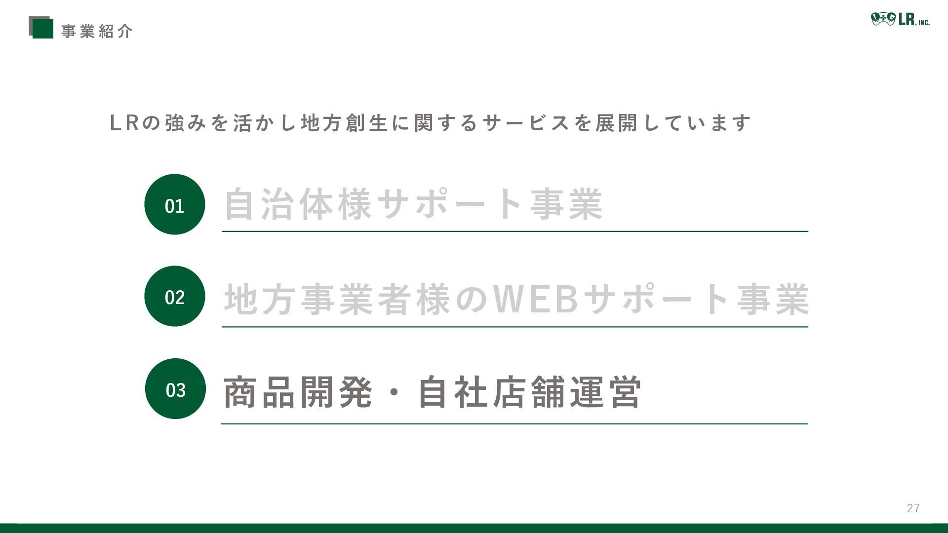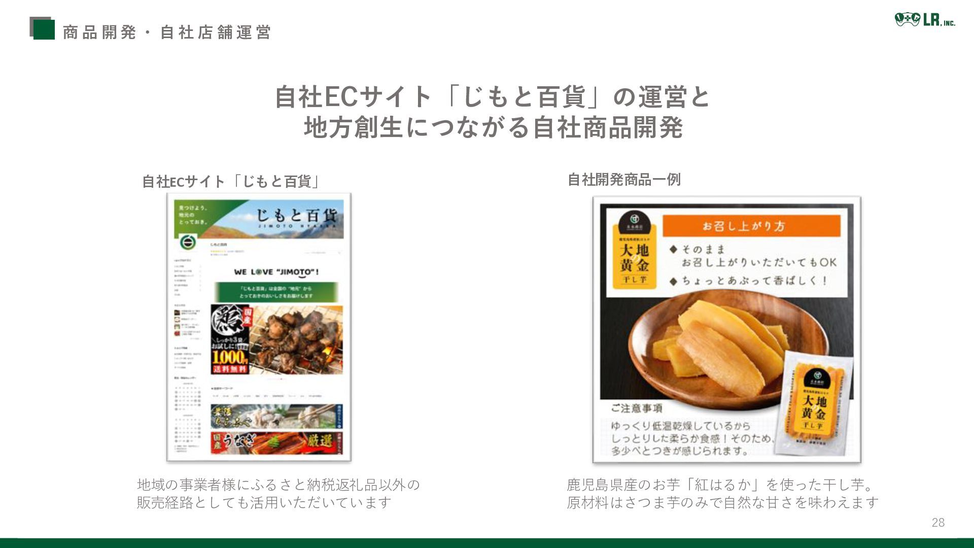 27 L Rの強みを活かし地方創生に関するサービスを展開しています 事 業 紹 介 地方事業者様のWEBサポート事業 商品開発・自社店舗運営 自治体様サポート事業