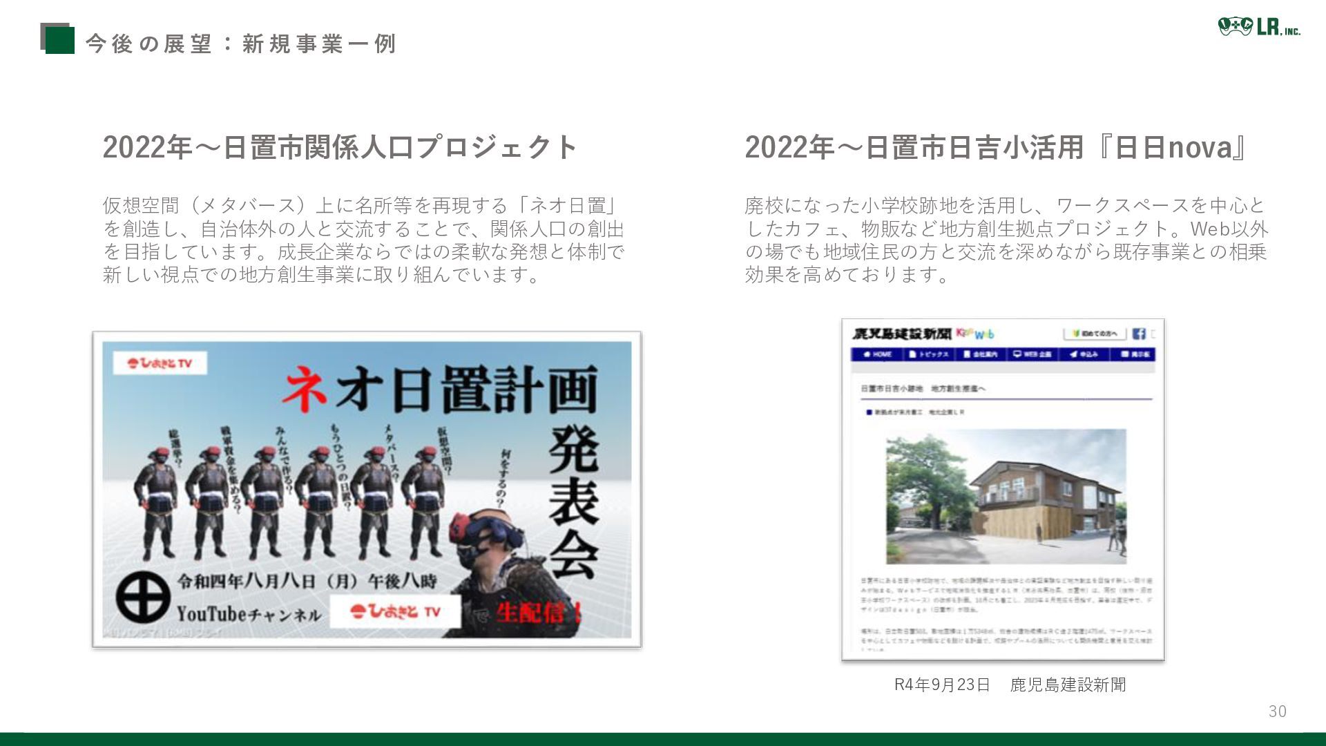 業 一 例 2022年~日置市関係人口プロジェクト 仮想空間(メタバース)上に名所等を再現する「ネオ日置」 を創造し、自治体外の人と交流することで、関係人口の創出 を目指しています。成長企業ならではの柔軟な発想と体制で 新しい視点での地方創生事業に取り組んでいます。 R4年9月23日 鹿児島建設新聞 2022年~日置市日吉小活用『日日nova』 廃校になった小学校跡地を活用し、ワークスペースを中心と したカフェ、物販など地方創生拠点プロジェクト。Web以外 の場でも地域住民の方と交流を深めながら既存事業との相乗 効果を高めております。