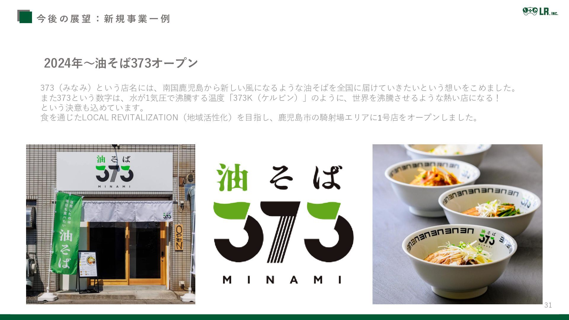 業 一 例 R4年9月23日 鹿児島建設新聞 2024年~油そば373オープン 373(みなみ)という店名には、南国鹿児島から新しい風になるような油そばを全国に届けていきたいという想いをこめました。 また373という数字は、水が1気圧で沸騰する温度「373K(ケルビン)」のように、世界を沸騰させるような熱い店になる! という決意も込めています。 食を通じたLOCAL REVITALIZATION(地域活性化)を目指し、鹿児島市の騎射場エリアに1号店をオープンしました。