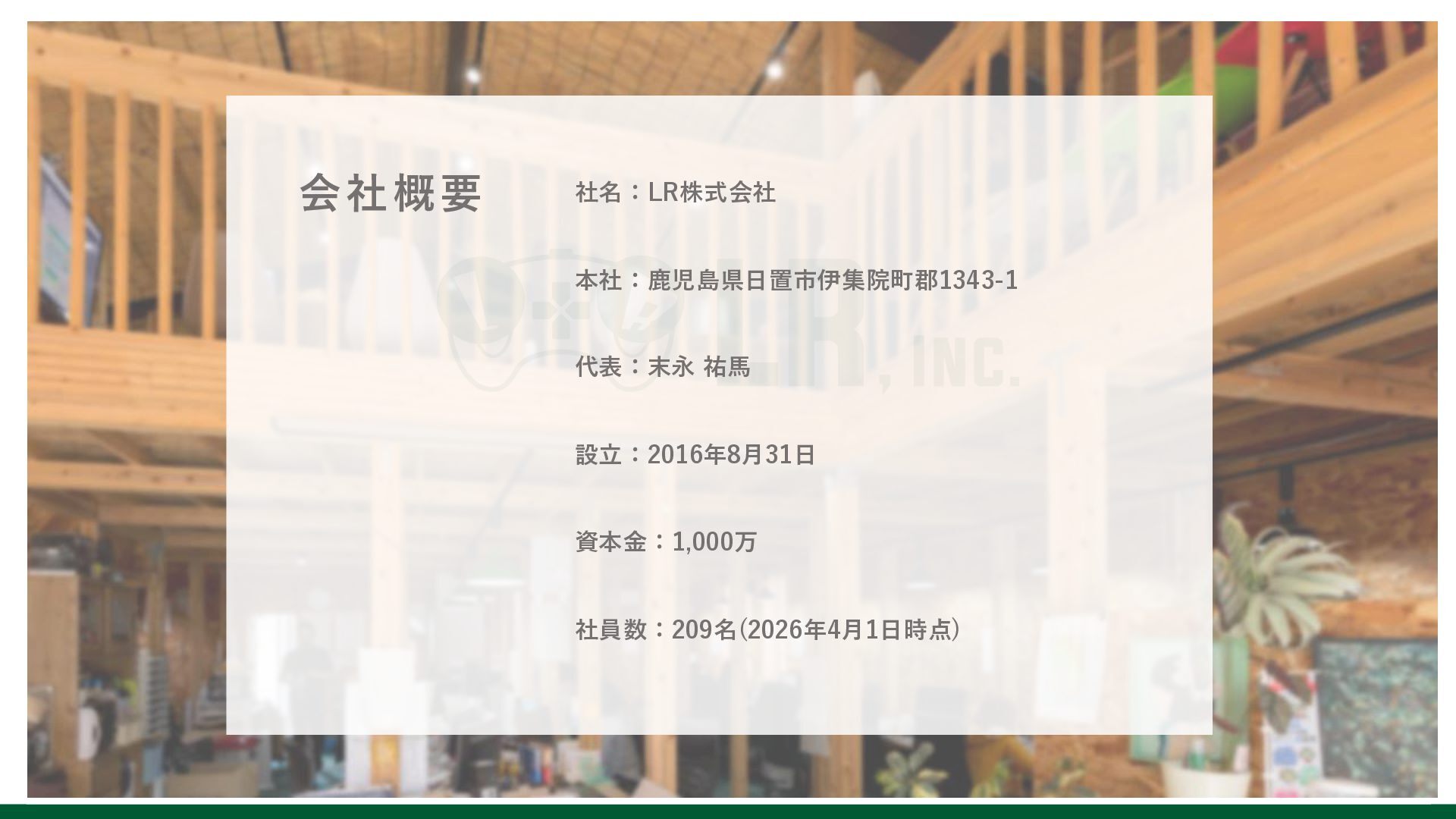 社名:LR株式会社 本社:鹿児島県日置市伊集院町郡1343-1 代表:末永 祐馬 設立:2016年8月31日 資本金:1,000万 社員数:209名(2026年4月1日時点) 会社概要