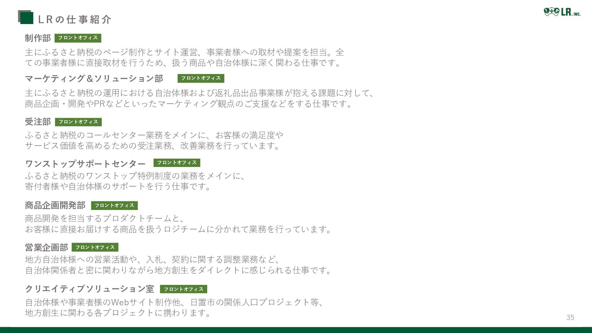 35 L R の 仕 事 紹 介 制作部 主にふるさと納税のページ制作とサイト運営、事業者様への取材や提案を担当。全