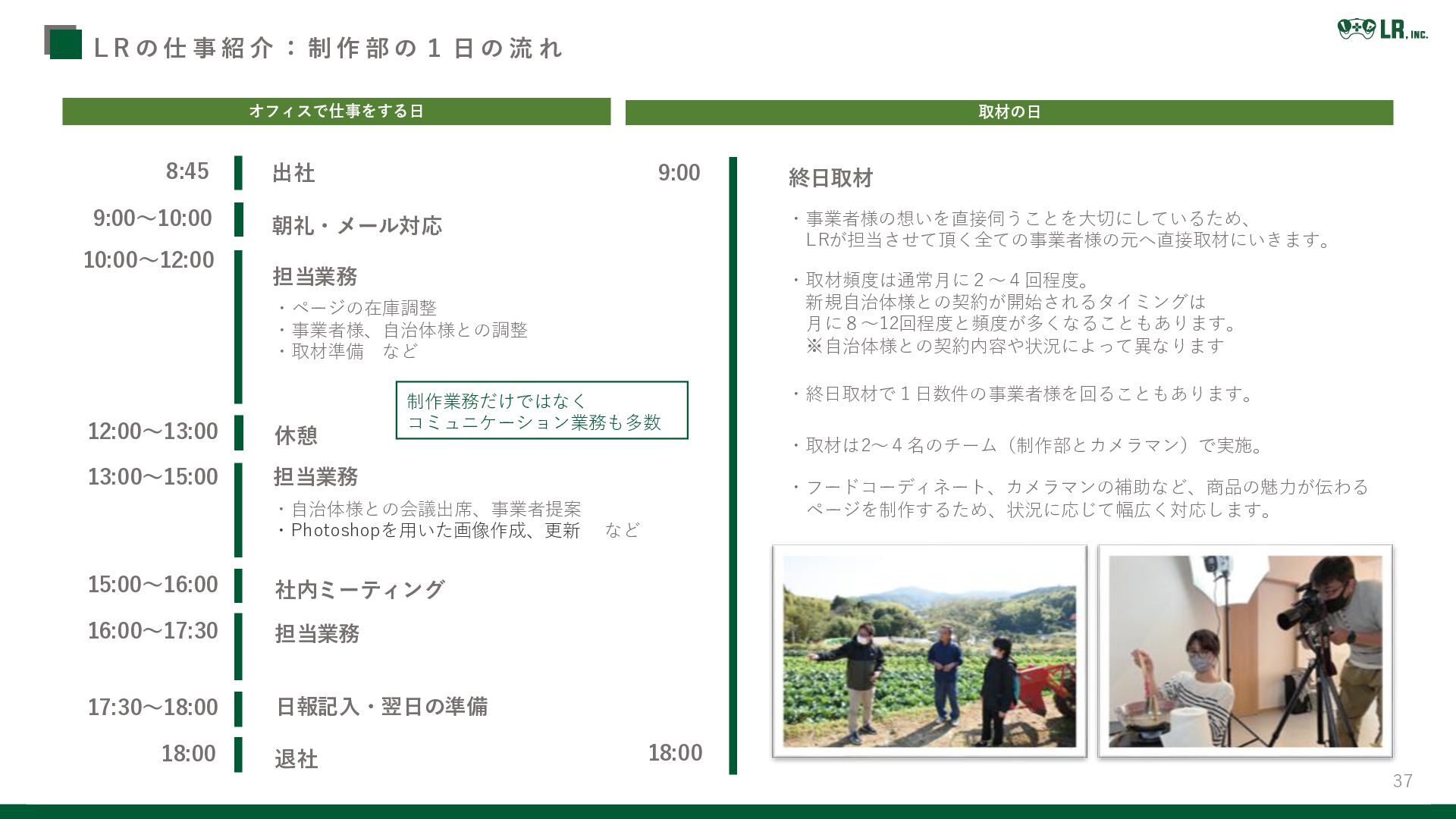 制 作 部 の 1 日 の 流 れ 9:00~10:00 10:00~12:00 12:00~13:00 13:00~15:00 15:00~16:00 16:00~17:30 17:30~18:00 18:00 出社 朝礼・メール対応 担当業務 ・ページの在庫調整 ・事業者様、自治体様との調整 ・取材準備 など 休憩 担当業務 ・自治体様との会議出席、事業者提案 ・Photoshopを用いた画像作成、更新 など 社内ミーティング 担当業務 日報記入・翌日の準備 退社 終日取材 ・事業者様の想いを直接伺うことを大切にしているため、 LRが担当させて頂く全ての事業者様の元へ直接取材にいきます。 ・取材頻度は通常月に2~4回程度。 新規自治体様との契約が開始されるタイミングは 月に8~12回程度と頻度が多くなることもあります。 ※自治体様との契約内容や状況によって異なります ・終日取材で1日数件の事業者様を回ることもあります。 ・取材は2~4名のチーム(制作部とカメラマン)で実施。 ・フードコーディネート、カメラマンの補助など、商品の魅力が伝わる ページを制作するため、状況に応じて幅広く対応します。 オフィスで仕事をする日 取材の日 9:00 18:00 制作業務だけではなく コミュニケーション業務も多数