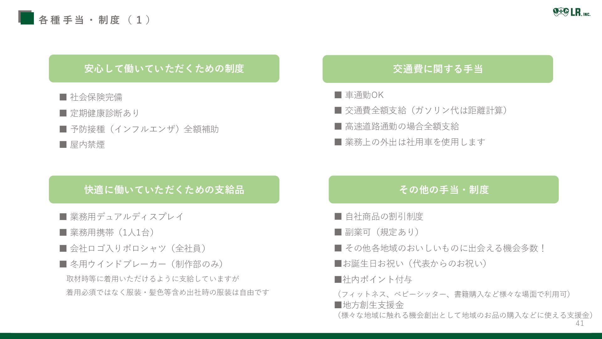 ) ▪ 社会保険完備 ▪ 定期健康診断あり ▪ 予防接種(インフルエンザ)全額補助 ▪ 屋内禁煙 会社から支給しているもの ▪ 業務用デュアルディスプレイ ▪ 業務用携帯(1人1台) ▪ 会社ロゴ入りポロシャツ(全社員) ▪ 冬用ウインドブレーカー(制作部のみ) 取材時等に着用いただけるように支給していますが 着用必須ではなく服装・髪色等含め出社時の服装は自由です その他 ▪ 自社商品の割引制度 ▪ 副業可(規定あり) ▪ その他各地域のおいしいものに出会える機会多数! ▪お誕生日お祝い(代表からのお祝い) ▪社内ポイント付与 (フィットネス、ベビーシッター、書籍購入など様々な場面で利用可) ▪地方創生支援金 (様々な地域に触れる機会創出として地域のお品の購入などに使える支援金) 交通費に関連する制度 ▪ 車通勤OK ▪ 交通費全額支給(ガソリン代は距離計算) ▪ 高速道路通勤の場合全額支給 ▪ 業務上の外出は社用車を使用します 安心して働いていただくための制度 快適に働いていただくための支給品 交通費に関する手当 その他の手当・制度