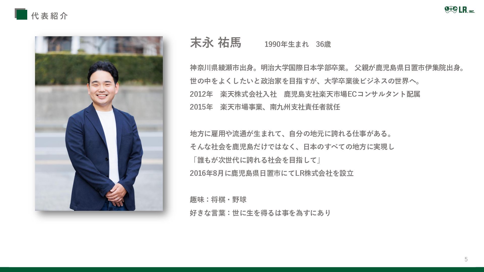 鹿児島支社楽天市場ECコンサルタント配属 2015年 楽天市場事業、南九州支社責任者就任 地方に雇用や流通が生まれて、自分の地元に誇れる仕事がある。 そんな社会を鹿児島だけではなく、日本のすべての地方に実現し 「誰もが次世代に誇れる社会を目指して」 2016年8月に鹿児島県日置市にてLR株式会社を設立 趣味:将棋・野球 好きな言葉:世に生を得るは事を為すにあり 代 表 紹 介