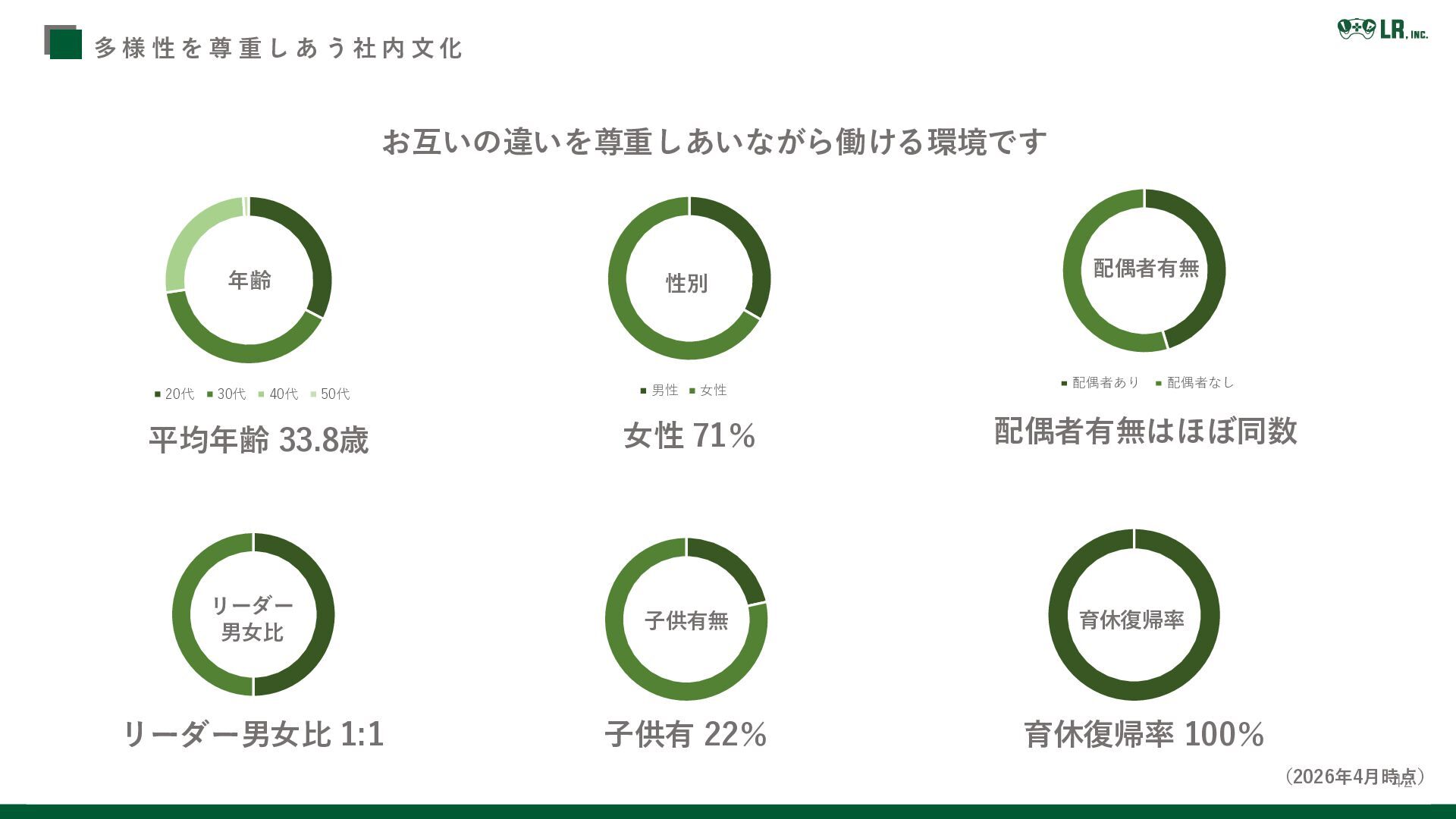 社 内 文 化 お互いの違いを尊重しあいながら働ける環境です 年齢 20代 30代 40代 50代 平均年齢 33.8歳 男性 女性 女性 71% 性別 配偶者あり 配偶者なし 配偶者有無はほぼ同数 子供有 22% 子供有無 配偶者有無 育休復帰率 育休復帰率 100% リーダー 男女比 リーダー男女比 1:1 (2026年4月時点)