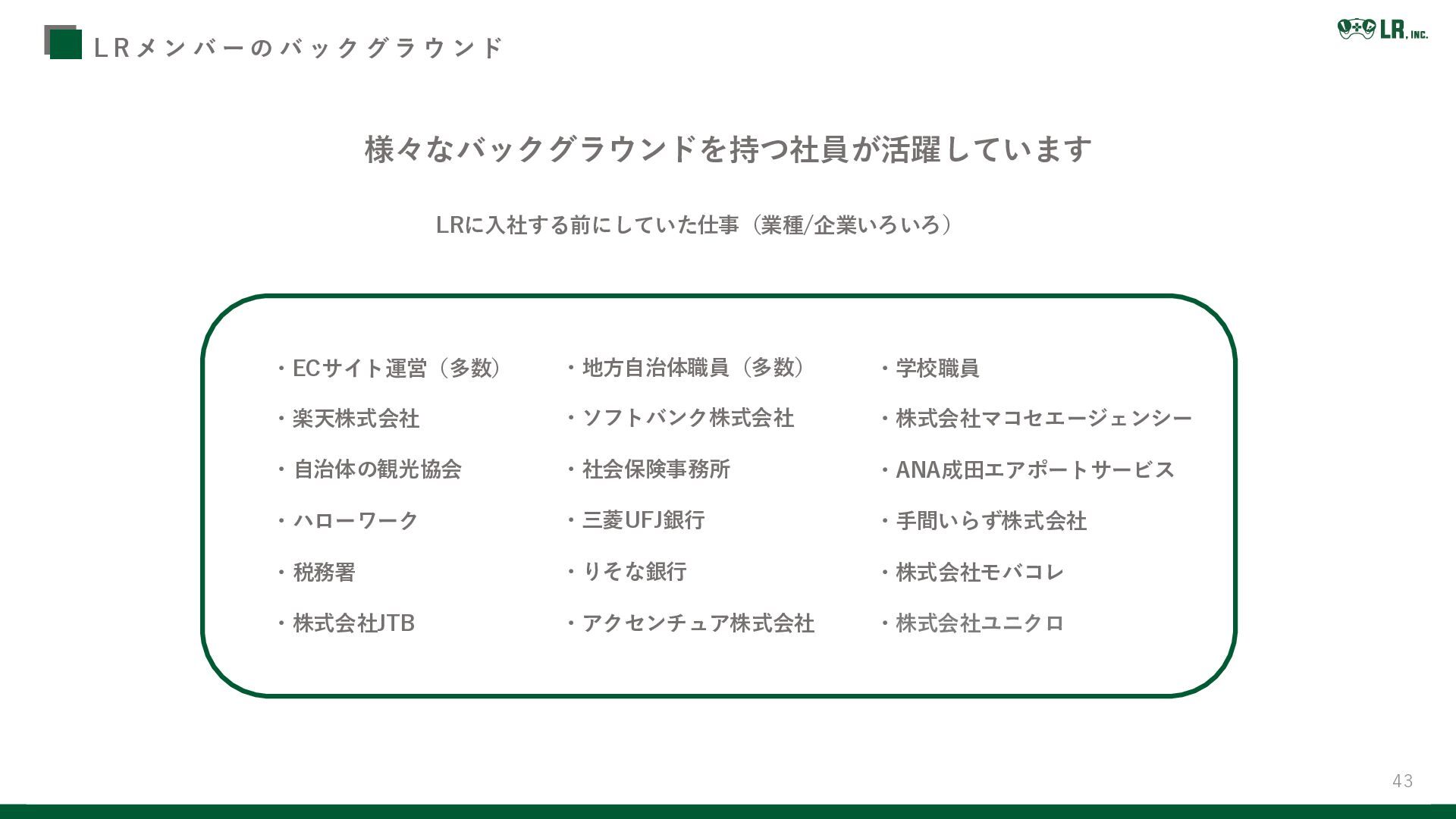 ク グ ラ ウ ン ド 様々なバックグラウンドを持つ社員が活躍しています LRに入社する前にしていた仕事(業種/企業いろいろ) ・ECサイト運営(多数) ・楽天株式会社 ・自治体の観光協会 ・ハローワーク ・税務署 ・株式会社JTB ・地方自治体職員(多数) ・ソフトバンク株式会社 ・社会保険事務所 ・三菱UFJ銀行 ・りそな銀行 ・アクセンチュア株式会社 ・学校職員 ・株式会社マコセエージェンシー ・ANA成田エアポートサービス ・手間いらず株式会社 ・株式会社モバコレ ・株式会社ユニクロ