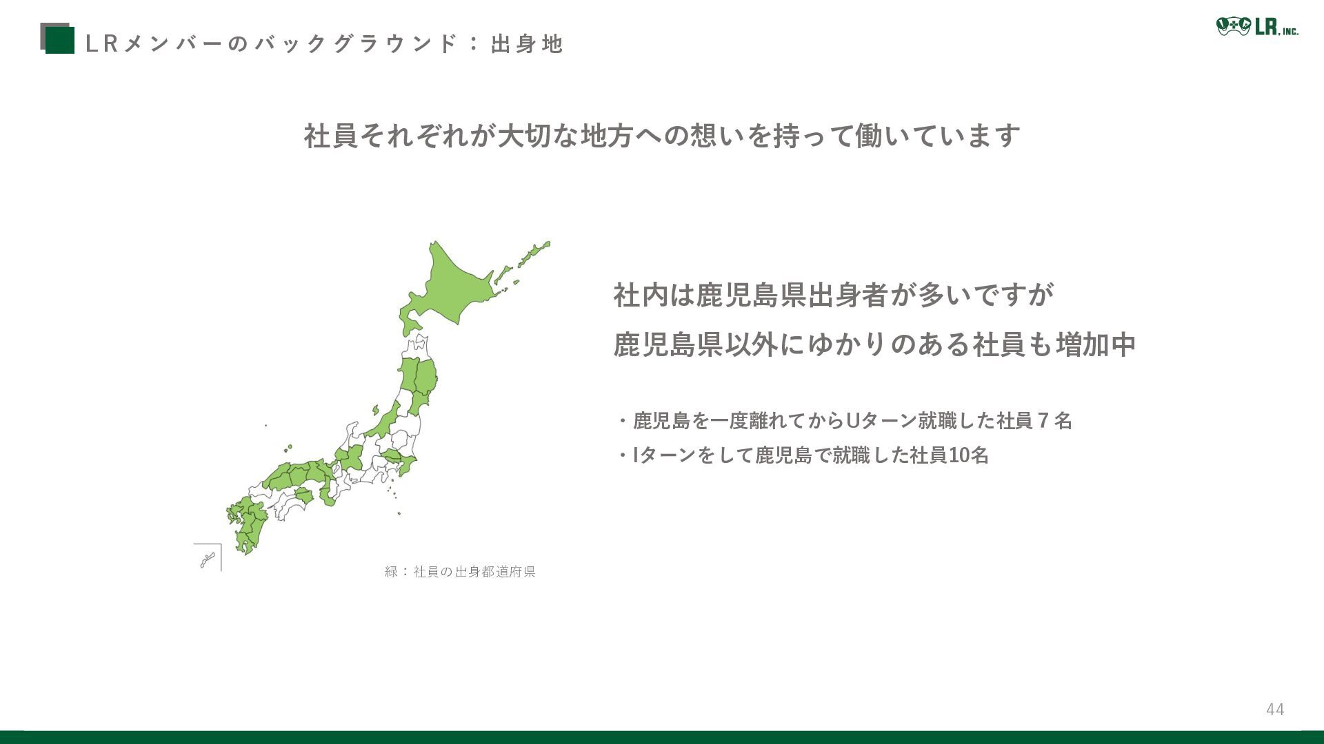 ク グ ラ ウ ン ド : 出 身 地 社内は鹿児島県出身者が多いですが 鹿児島県以外にゆかりのある社員も増加中 ・鹿児島を一度離れてからUターン就職した社員7名 ・Iターンをして鹿児島で就職した社員10名 社員それぞれが大切な地方への想いを持って働いています 緑:社員の出身都道府県