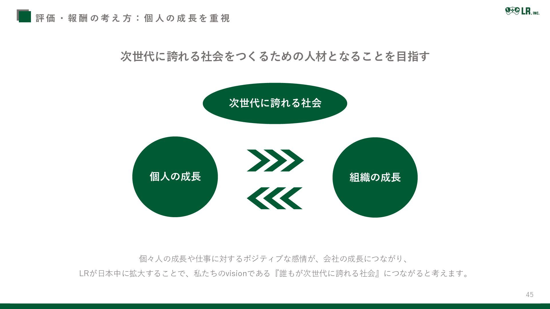 : 個 人 の 成 長 を 重 視 個々人の成長や仕事に対するポジティブな感情が、会社の成長につながり、 LRが日本中に拡大することで、私たちのvisionである『誰もが次世代に誇れる社会』につながると考えます。 次世代に誇れる社会をつくるための人材となることを目指す 次世代に誇れる社会 個人の成長 組織の成長