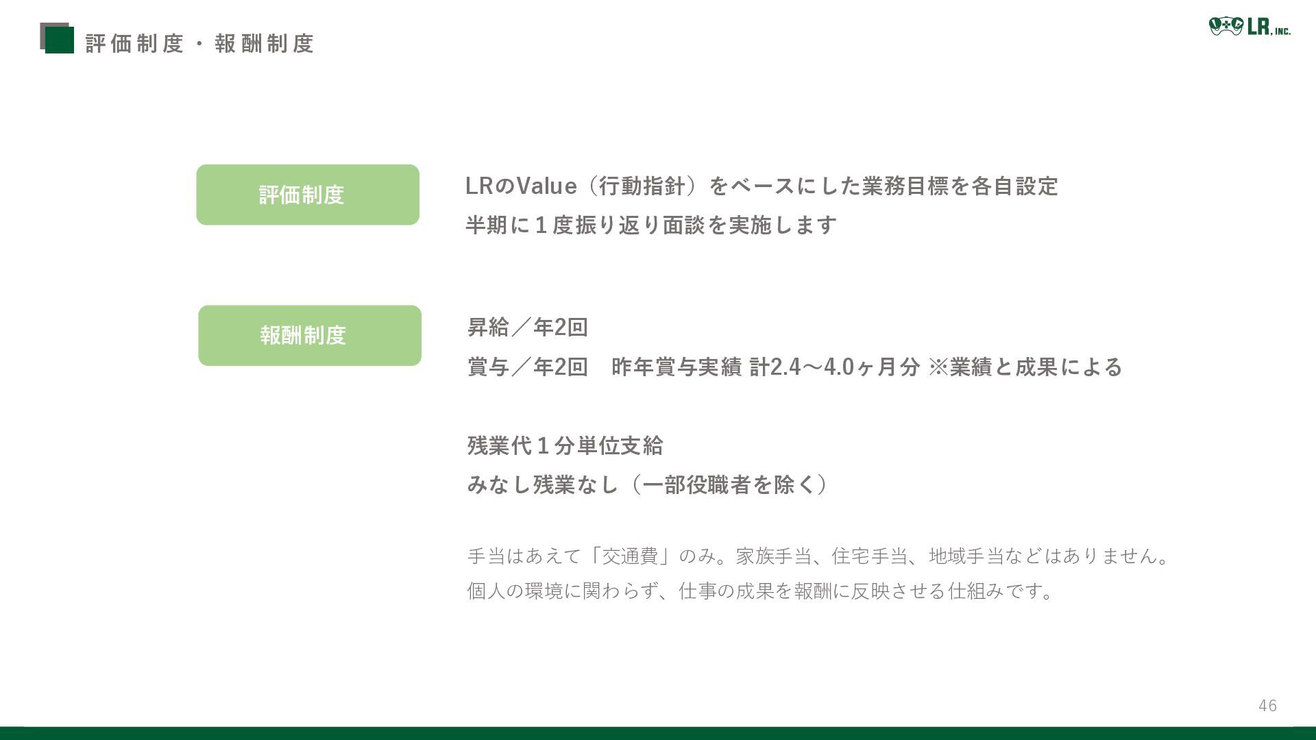 手当はあえて「交通費」のみ。家族手当、住宅手当、地域手当などはありません。 個人の環境に関わらず、仕事の成果を報酬に反映させる仕組みです。 LRのValue(行動指針)をベースにした業務目標を各自設定 半期に1度振り返り面談を実施します 評価制度 昇給/年2回 賞与/年2回 昨年賞与実績 計2.4~4.0ヶ月分 ※業績と成果による 残業代1分単位支給 みなし残業なし(一部役職者を除く) 報酬制度