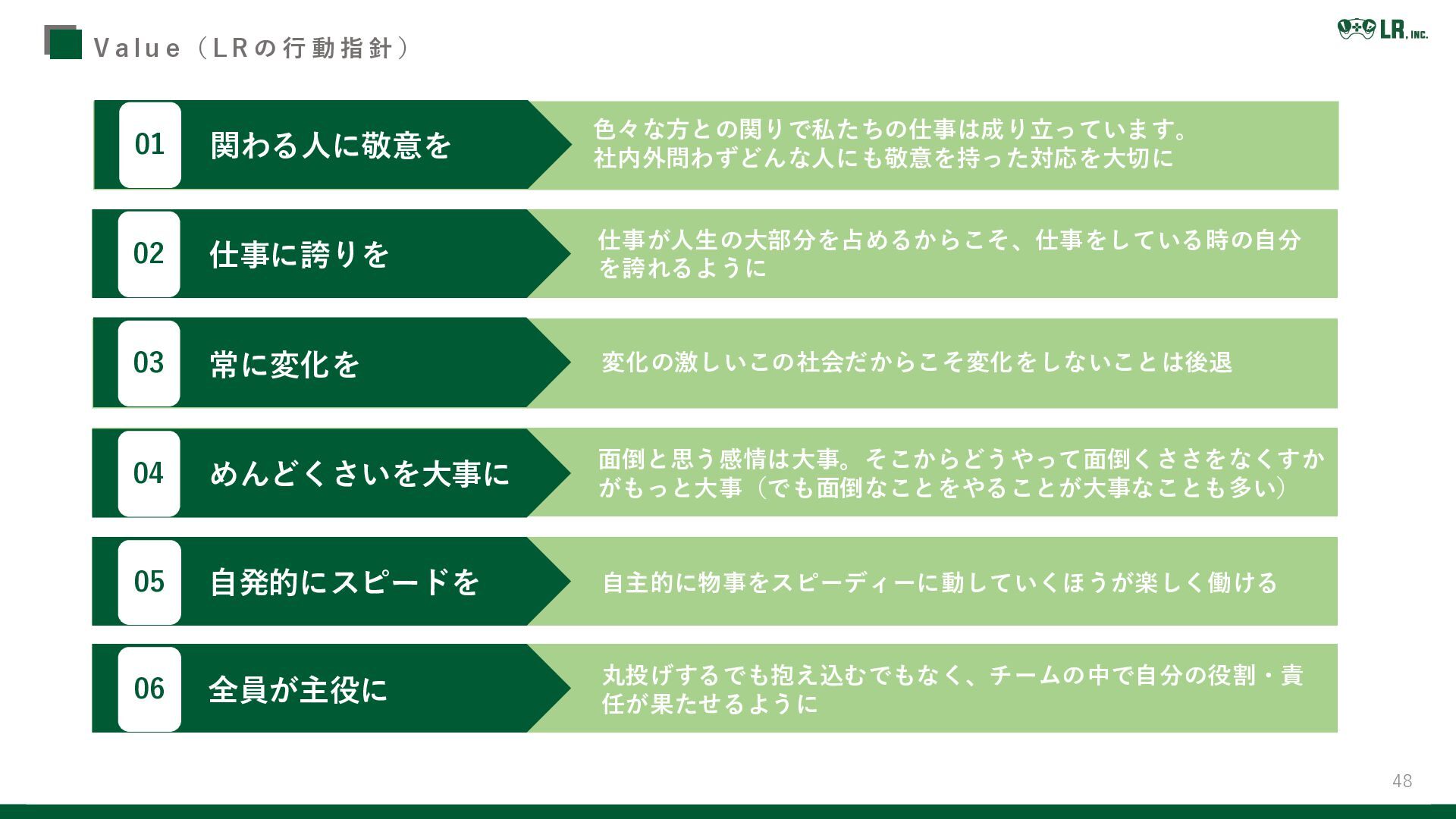 01 仕事に誇りを 常に変化を めんどくさいを大事に 自発的にスピードを 02 03 04 05 全員が主役に 06