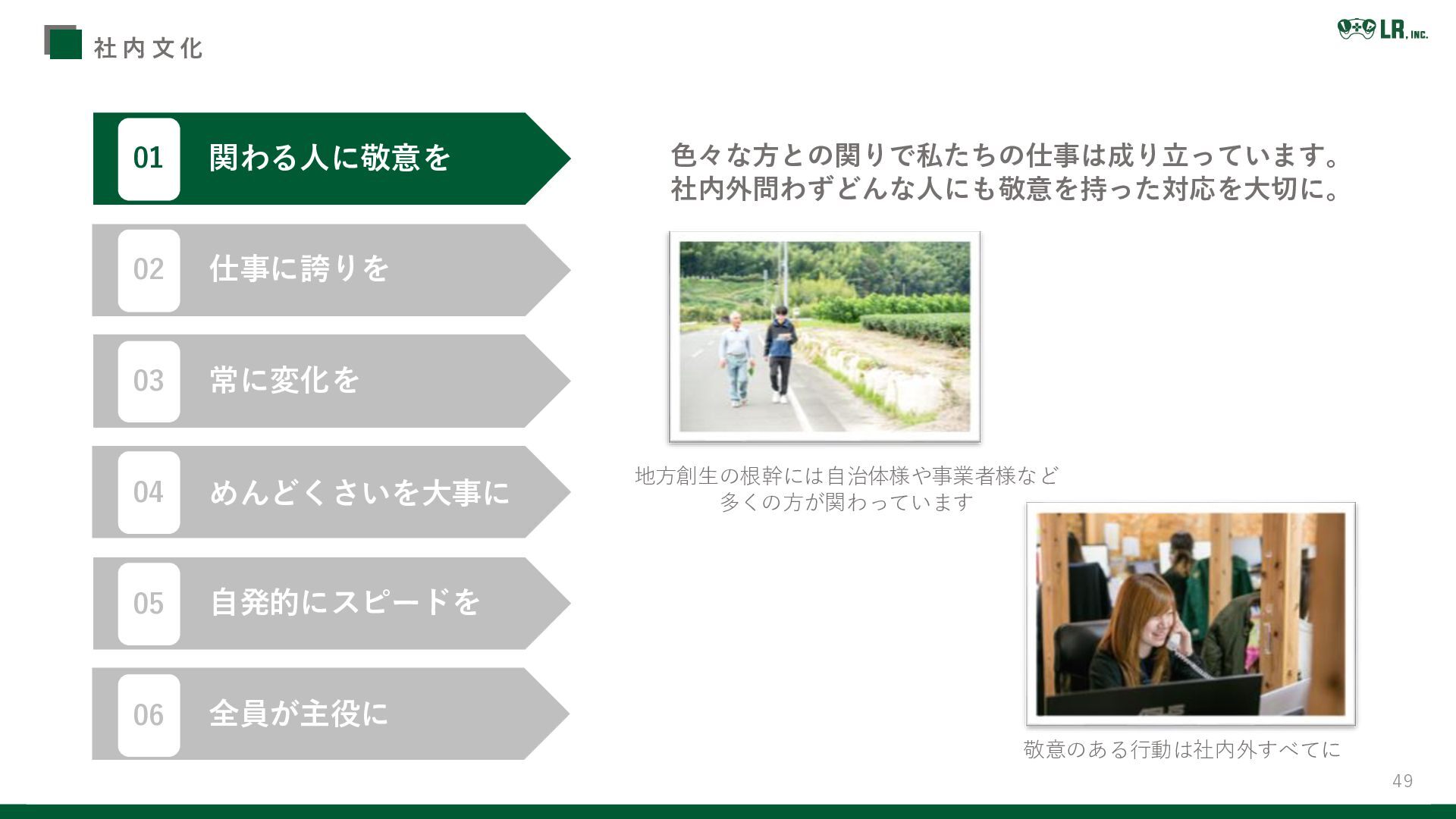 49 社 内 文 化 敬意のある行動は社内外すべてに 関わる人に敬意を 01 地方創生の根幹には自治体様や事業者様など 多くの方が関わっています