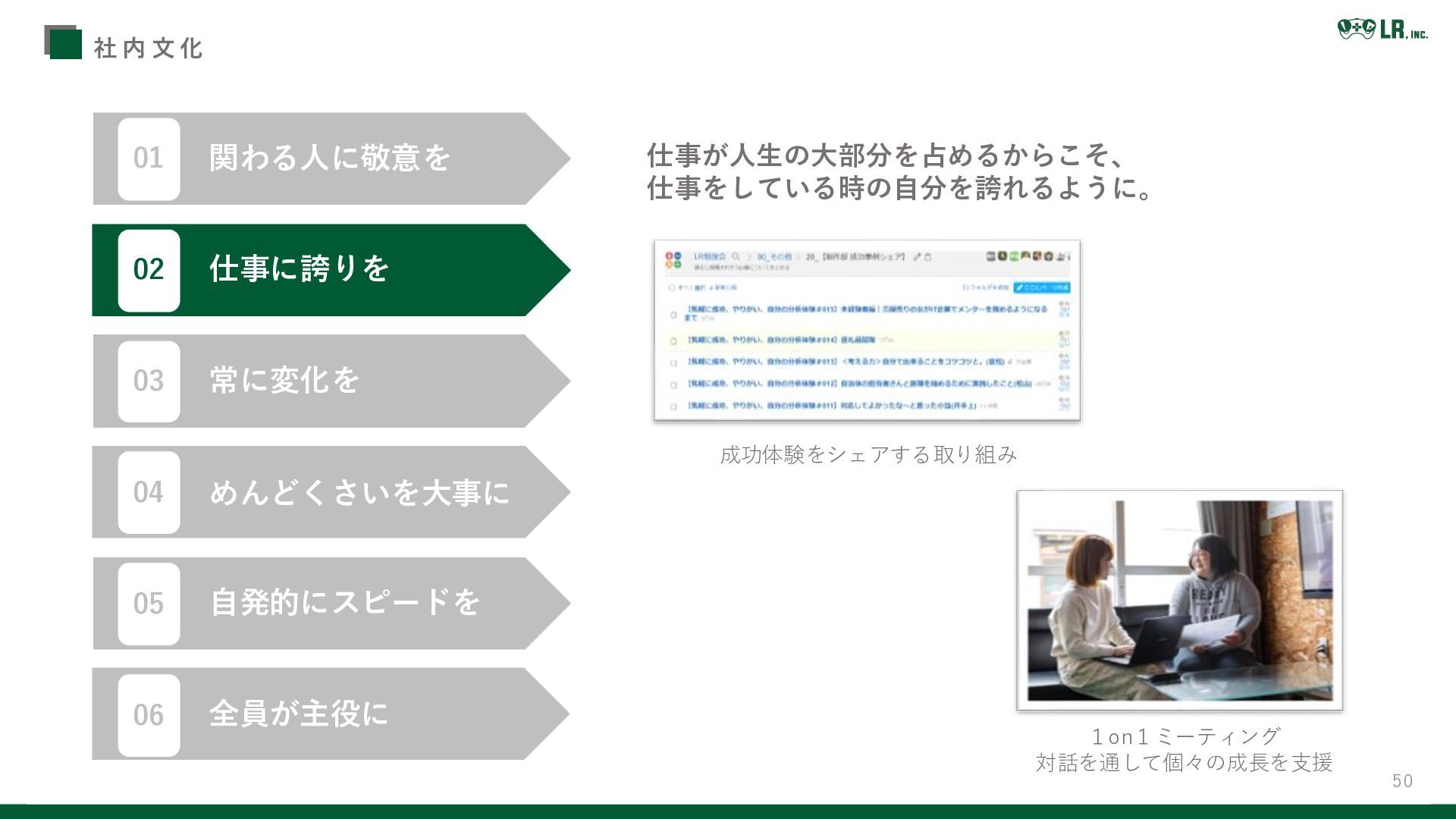 50 社 内 文 化 1on1ミーティング 対話を通して個々の成長を支援 成功体験をシェアする取り組み 仕事が人生の大部分を占めるからこそ、 仕事をしている時の自分を誇れるように。