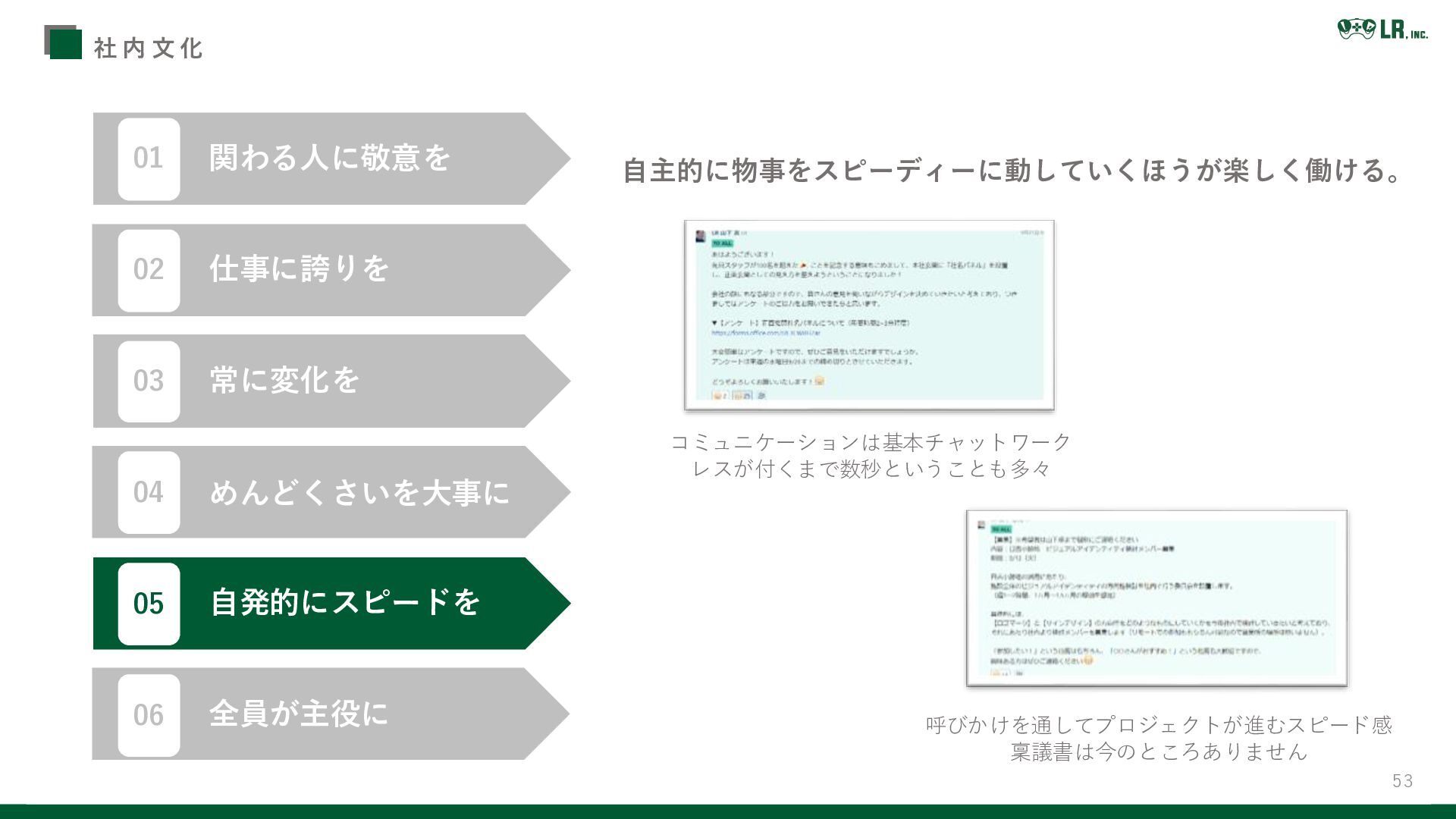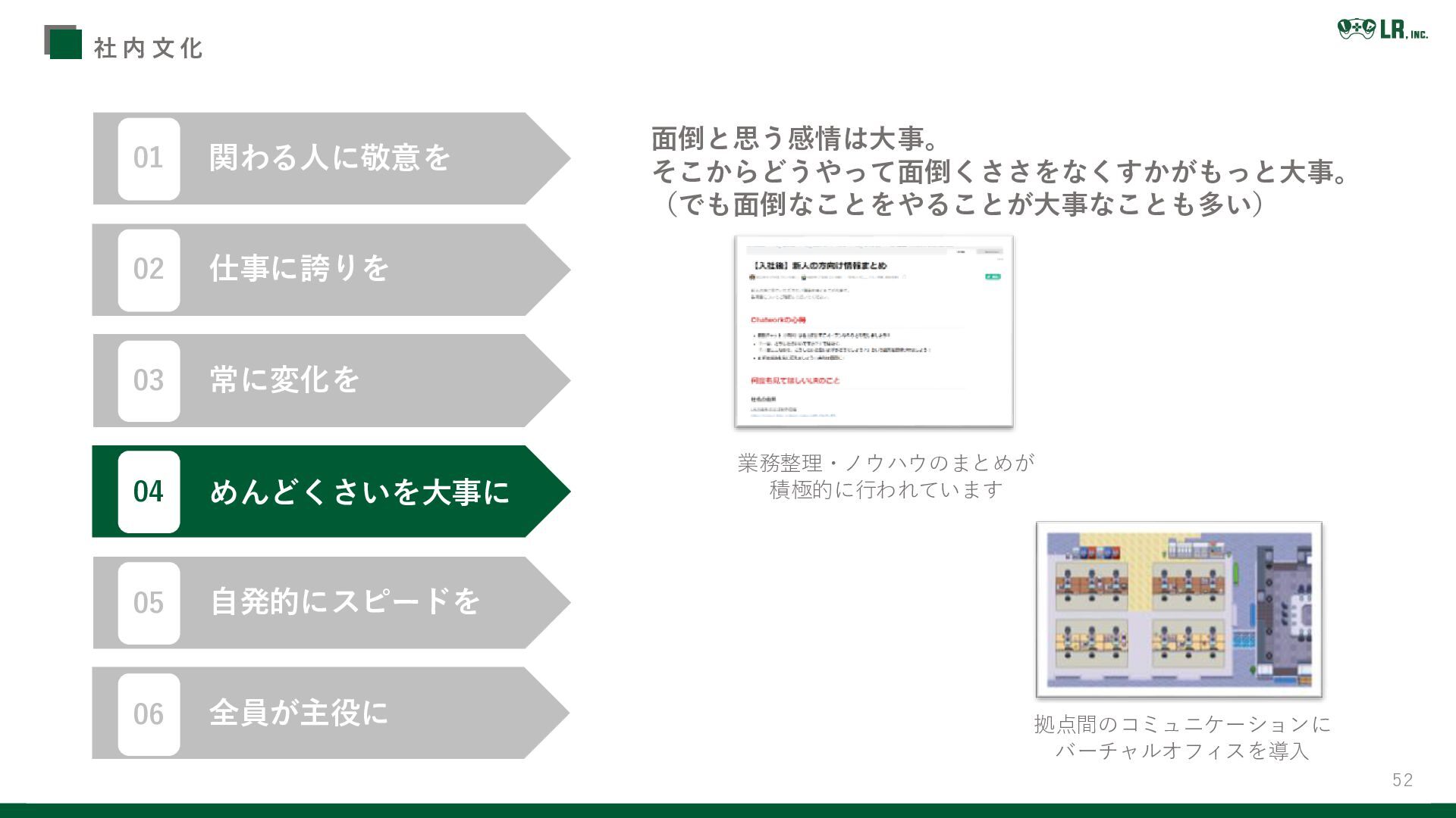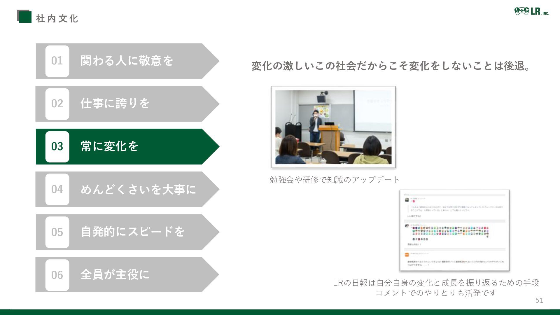 51 社 内 文 化 勉強会や研修で知識のアップデート LRの日報は自分自身の変化と成長を振り返るための手段 コメントでのやりとりも活発です 変化の激しいこの社会だからこそ変化をしないことは後退。 関わる人に敬意を