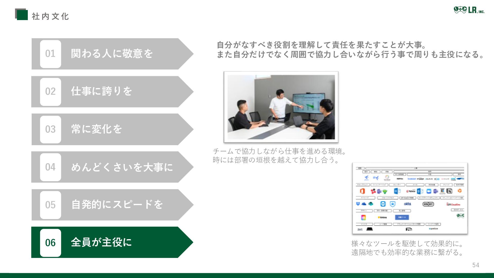 常に変化を めんどくさいを大事に 自発的にスピードを 02 03 04 05 全員が主役に 06 自分がなすべき役割を理解して責任を果たすことが大事。 また自分だけでなく周囲で協力し合いながら行う事で周りも主役になる。 チームで協力しながら仕事を進める環境。 時には部署の垣根を越えて協力し合う。 様々なツールを駆使して効果的に。 遠隔地でも効率的な業務に繋がる。
