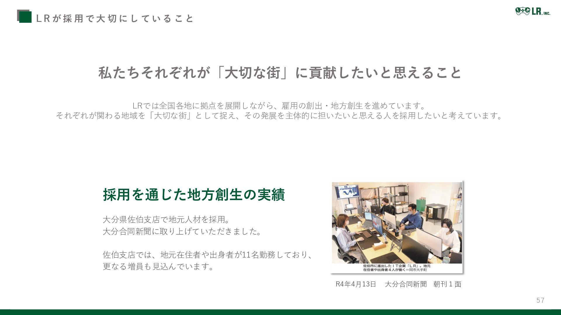 57 私たちそれぞれが「大切な街」に貢献したいと思えること LRでは全国各地に拠点を展開しながら、雇用の創出・地方創生を進めています。 それぞれが関わる地域を「大切な街」として捉え、その発展を主体的に担いたいと思える人を採用したいと考えています。 R4年4月13日 大分合同新聞 朝刊 1 面 採用を通じた地方創生の実績