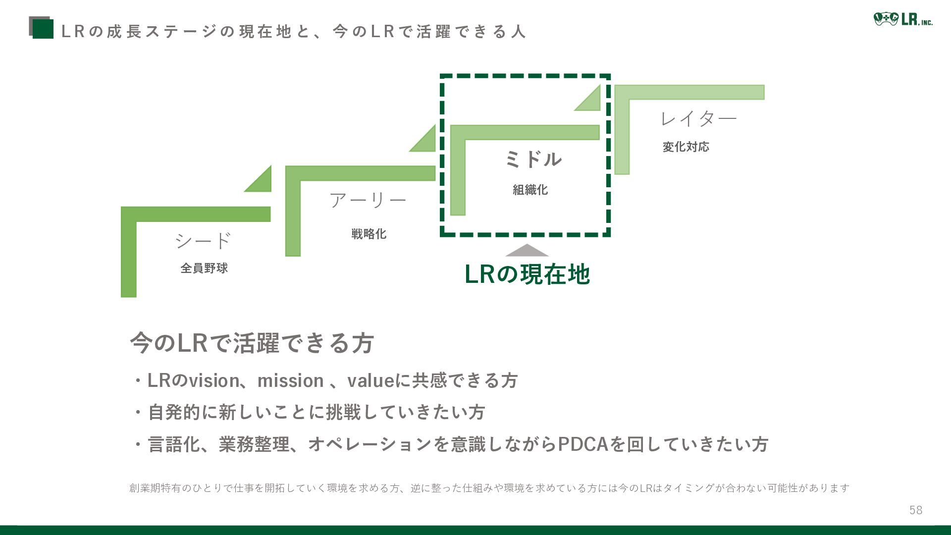 の 現 在 地 と 、 今 の L R で 活 躍 で き る 人 シード アーリー ミドル レイタ― 全員野球 戦略化 組織化 変化対応 今のLRで活躍できる方 ・LRのvision、mission 、valueに共感できる方 ・自発的に新しいことに挑戦していきたい方 ・言語化、業務整理、オペレーションを意識しながらPDCAを回していきたい方 創業期特有のひとりで仕事を開拓していく環境を求める方、逆に整った仕組みや環境を求めている方には今のLRはタイミングが合わない可能性があります LRの現在地