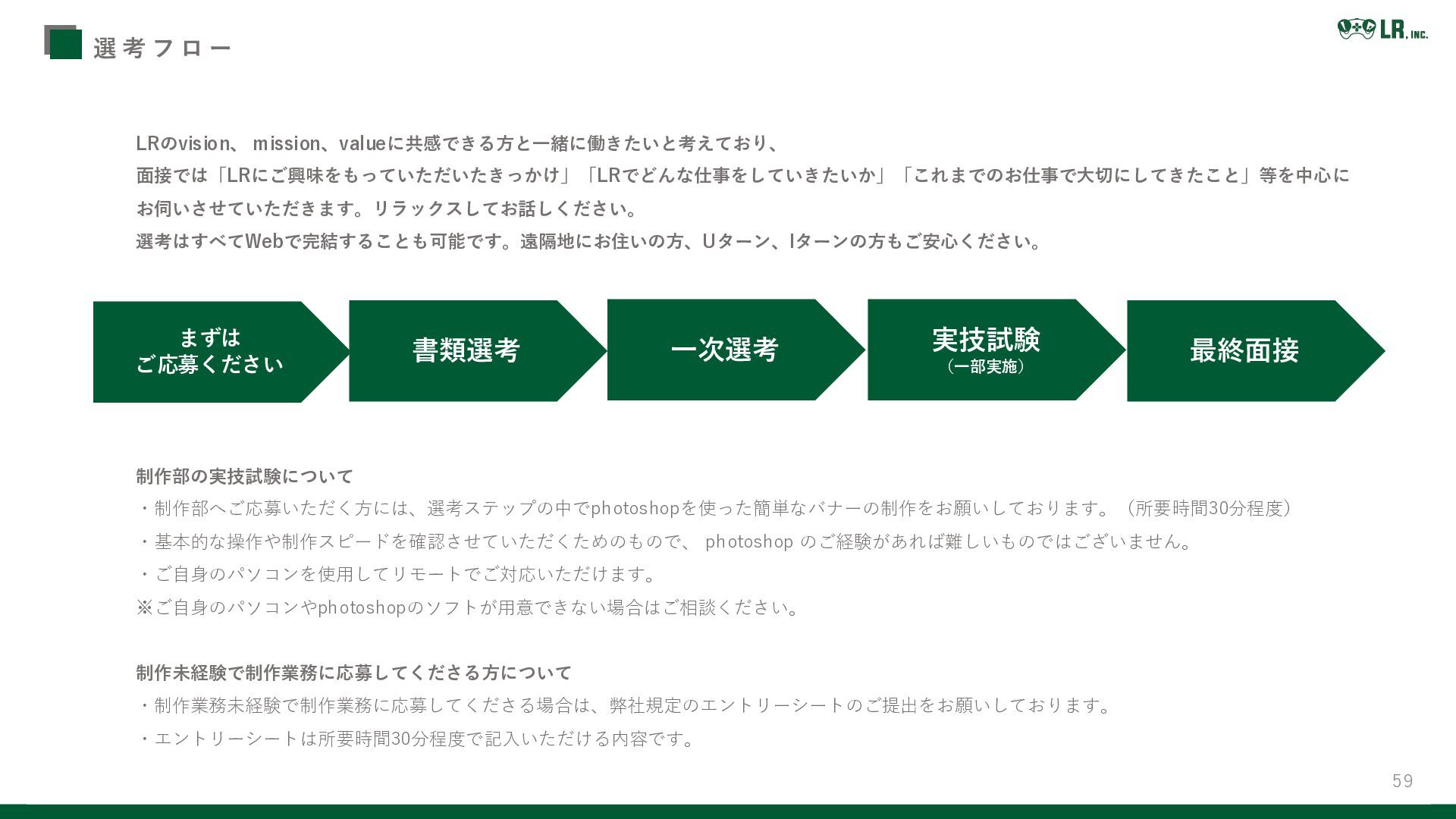 59 選 考 フ ロ ー LRのvision、 mission、valueに共感できる方と一緒に働きたいと考えており、 面接では「LRにご興味をもっていただいたきっかけ」「LRでどんな仕事をしていきたいか」「これまでのお仕事で大切にしてきたこと」等を中心に お伺いさせていただきます。リラックスしてお話しください。