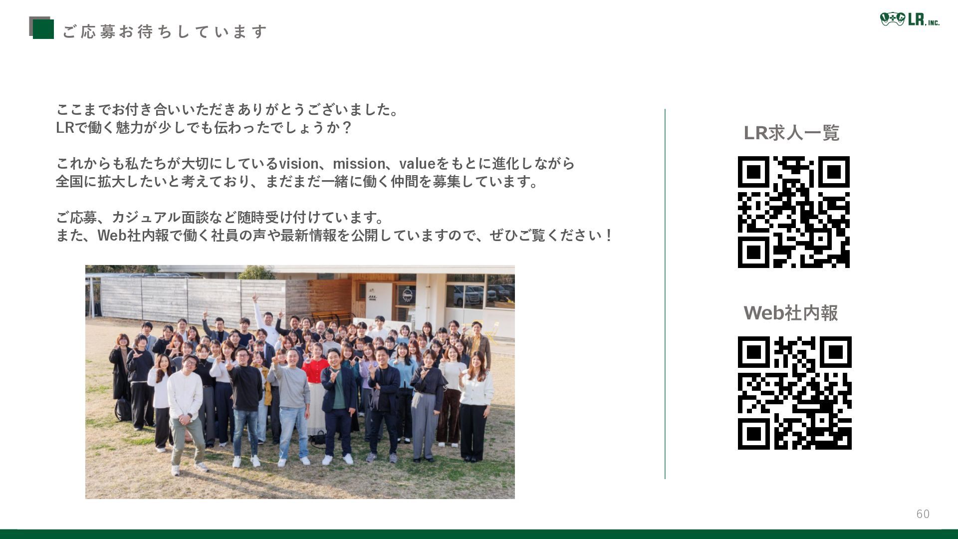 60 ここまでお付き合いいただきありがとうございました。 LRで働く魅力が少しでも伝わったでしょうか? これからも私たちが大切にしているvision、mission、valueをもとに進化しながら 全国に拡大したいと考えており、まだまだ一緒に働く仲間を募集しています。 ご応募、カジュアル面談など随時受け付けています。 また、Web社内報で働く社員の声や最新情報を公開していますので、ぜひご覧ください! LR求人一覧 Web社内報 ご