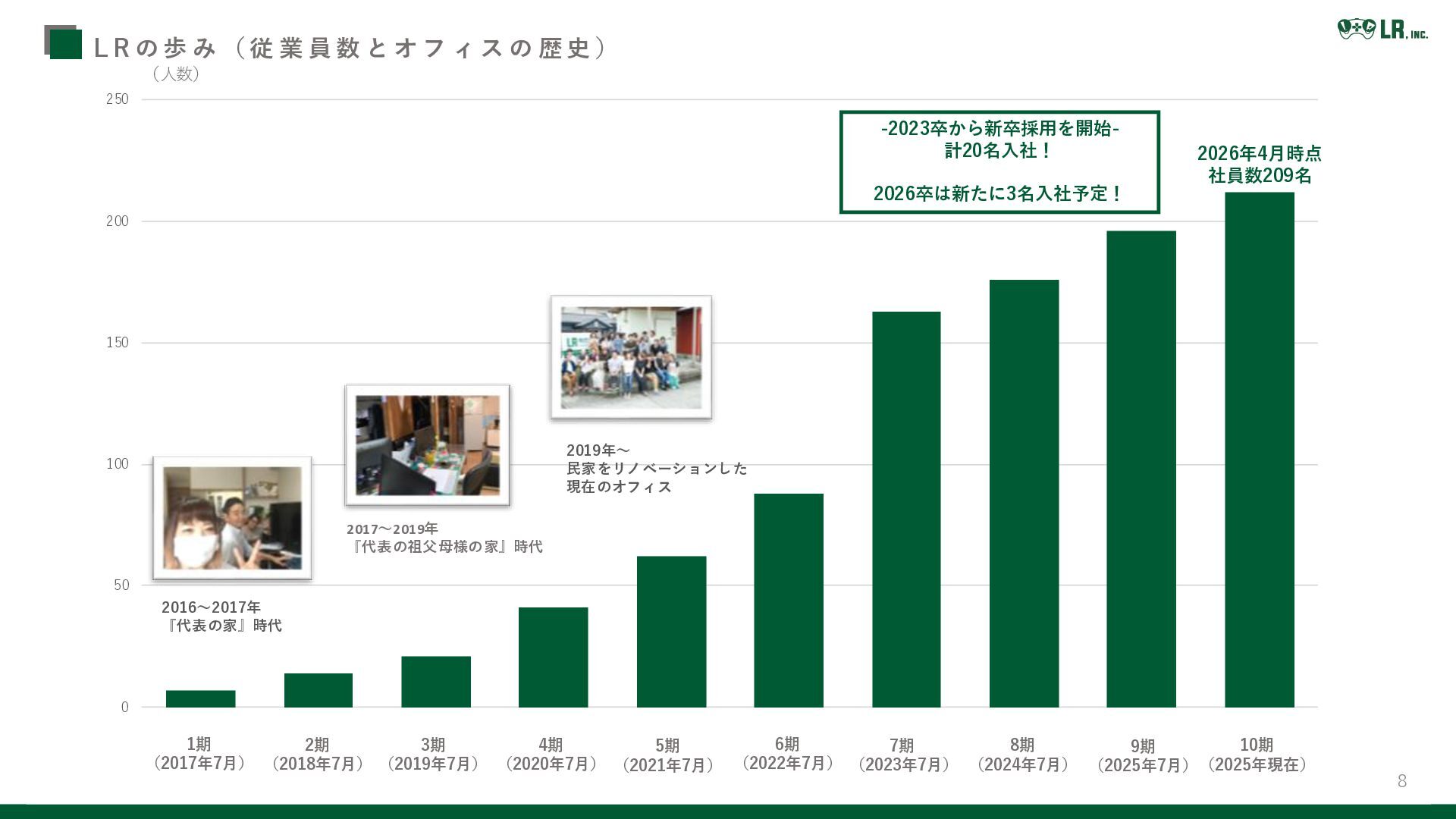 R の 歩 み ( 従 業 員 数 と オ フ ィ ス の 歴 史 ) 1期 (2017年7月) 2期 (2018年7月) 3期 (2019年7月) 4期 (2020年7月) 5期 (2021年7月) 6期 (2022年7月) 7期 (2023年7月) 8期 (2024年7月) 2017~2019年 『代表の祖父母様の家』時代 (人数) 9期 (2025年7月) 2019年~ 民家をリノベーションした 現在のオフィス 10期 (2025年現在) -2023卒から新卒採用を開始- 計20名入社! 2026卒は新たに3名入社予定! 2026年4月時点 社員数209名