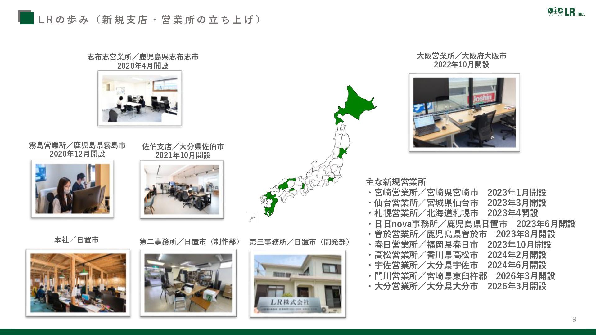 L R の 歩 み ( 新 規 支 店 ・ 営 業 所 の 立 ち 上 げ ) 大阪営業所/大阪府大阪市 2022年10月開設 主な新規営業所 ・宮崎営業所/宮崎県宮崎市 2023年1月開設 ・仙台営業所/宮城県仙台市 2023年3月開設 ・札幌営業所/北海道札幌市 2023年4開設 ・日日nova事務所/鹿児島県日置市 2023年6月開設 ・曽於営業所/鹿児島県曽於市 2023年8月開設 ・春日営業所/福岡県春日市 2023年10月開設 ・高松営業所/香川県高松市 2024年2月開設 ・宇佐営業所/大分県宇佐市 2024年6月開設 ・門川営業所/宮崎県東臼杵郡 2026年3月開設 ・大分営業所/大分県大分市 2026年3月開設