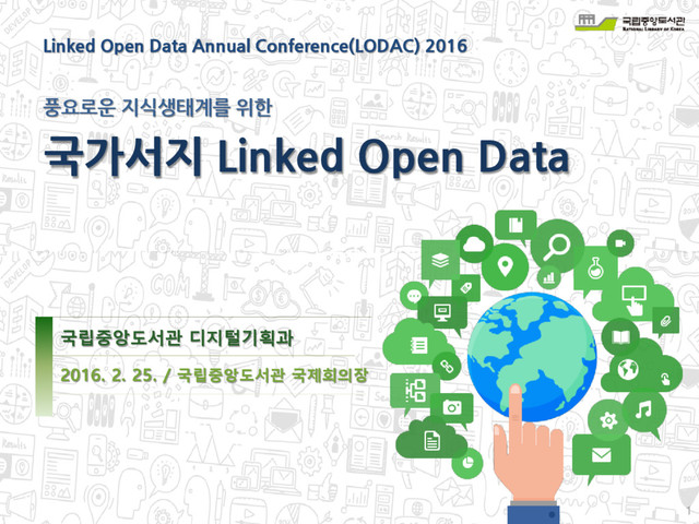 생물정보LOD 2,833 nlon:relatedSpecies 812,285 KDATA 5,060 nlon:relatedHeritage nlon:relatedCountry NDS : L 174,505 owl:sameAs RISS 629,887 owl:sameAs 저자명-국내 LOD RISS LOD 142 owl:sameAs 603 한국사 LOD 53 KDATA 288 NDS : L 120 소계 812,888 국외 서지 해외도서관 서지 노르웨이오슬로공립도서관 122 owl:sameAs 845,528 독일국립도서관 420,709 스웨덴국립도서관 106,163 영국국립도서관 209,894 캠브리지대학도서관 25,272 프랑스국립도서관 4,258 OCLC WorldCat 79,110 해외도서관 주제명 미국의회도서관 857,755 dct:subject 1,308,315 일본국립국회도서관 450,560 해외 저자명 LC Autority File 8,629 dcterms:creator 8,629 주제명 해외도서관 미국의회도서관 10,378 skos:closeMatch 13,931 일본국립국회도서관 3,553 저자명 해외LOD LC Autority File 2,376 owl:sameAs 7,158 가상국제전거파일(VIAF) 4,752 DBPedia 30 소계 2,183,561 총 계 (17개관 24개 데이터셋 ) 2,996,449 국내외 LOD와의 연계(Interlinking) 3. 국가서지 LOD 발행 현황