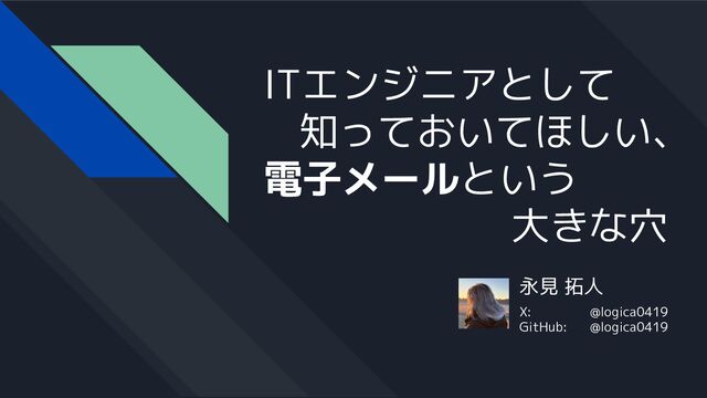 2024/9/29 セキュリティ・ミニキャンプ in 山梨 2024 専門講座にて講義をした際の資料です。 あまり語られることのない、電子メールのセキュリティについて詳しくまとめました。