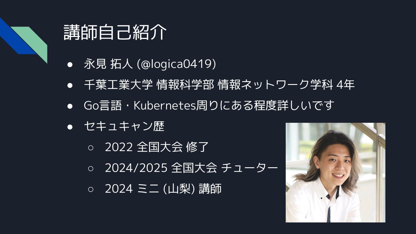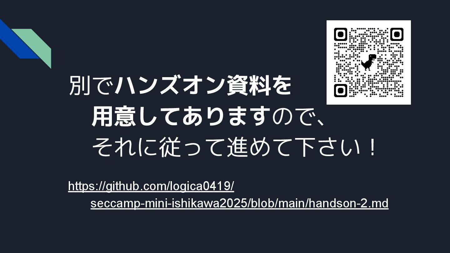 途中出てくるハンズオンの資料は、こちらからアクセスしてください。 https://github.com/logica0419/seccamp-mini-ishikawa2025