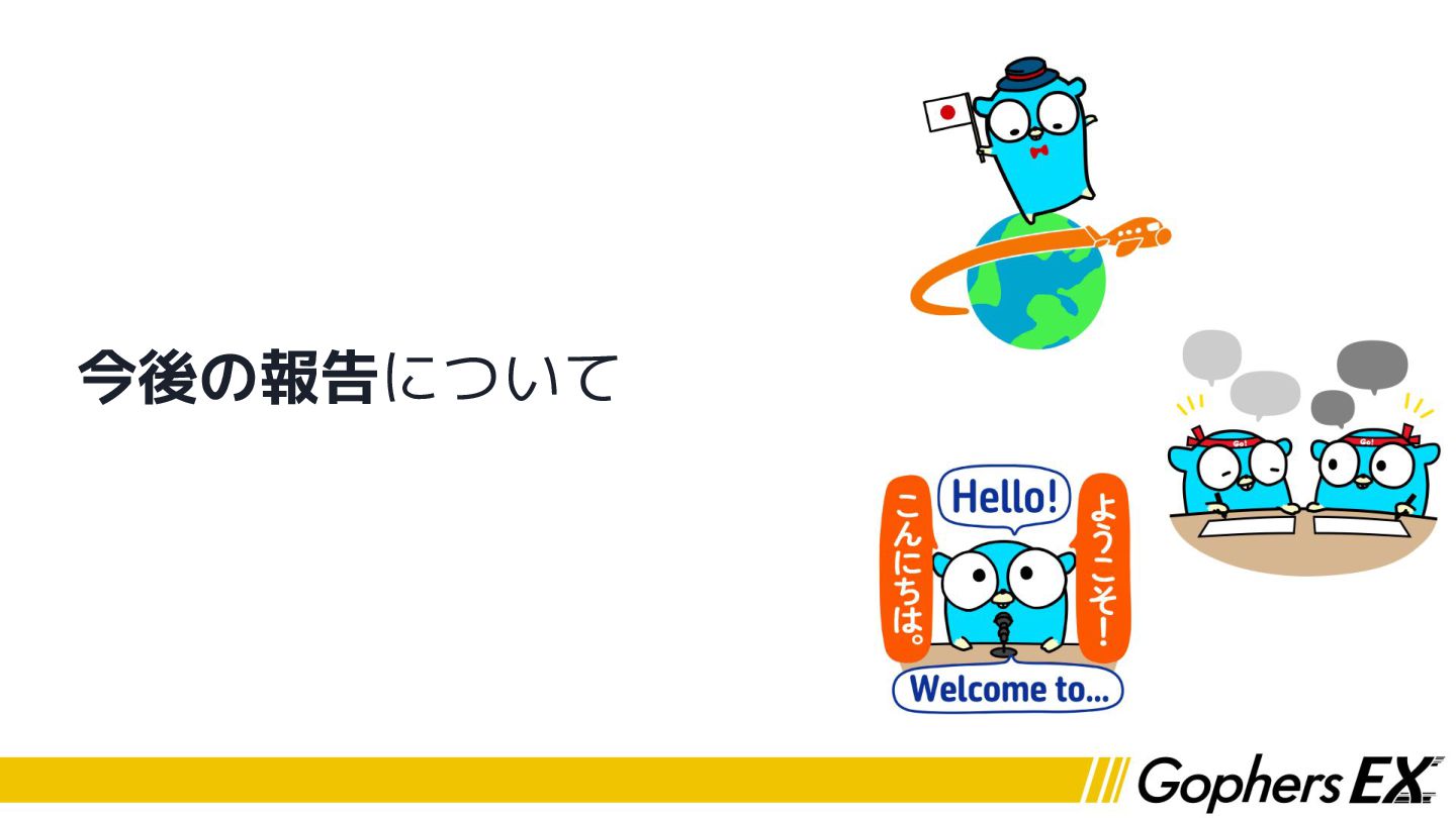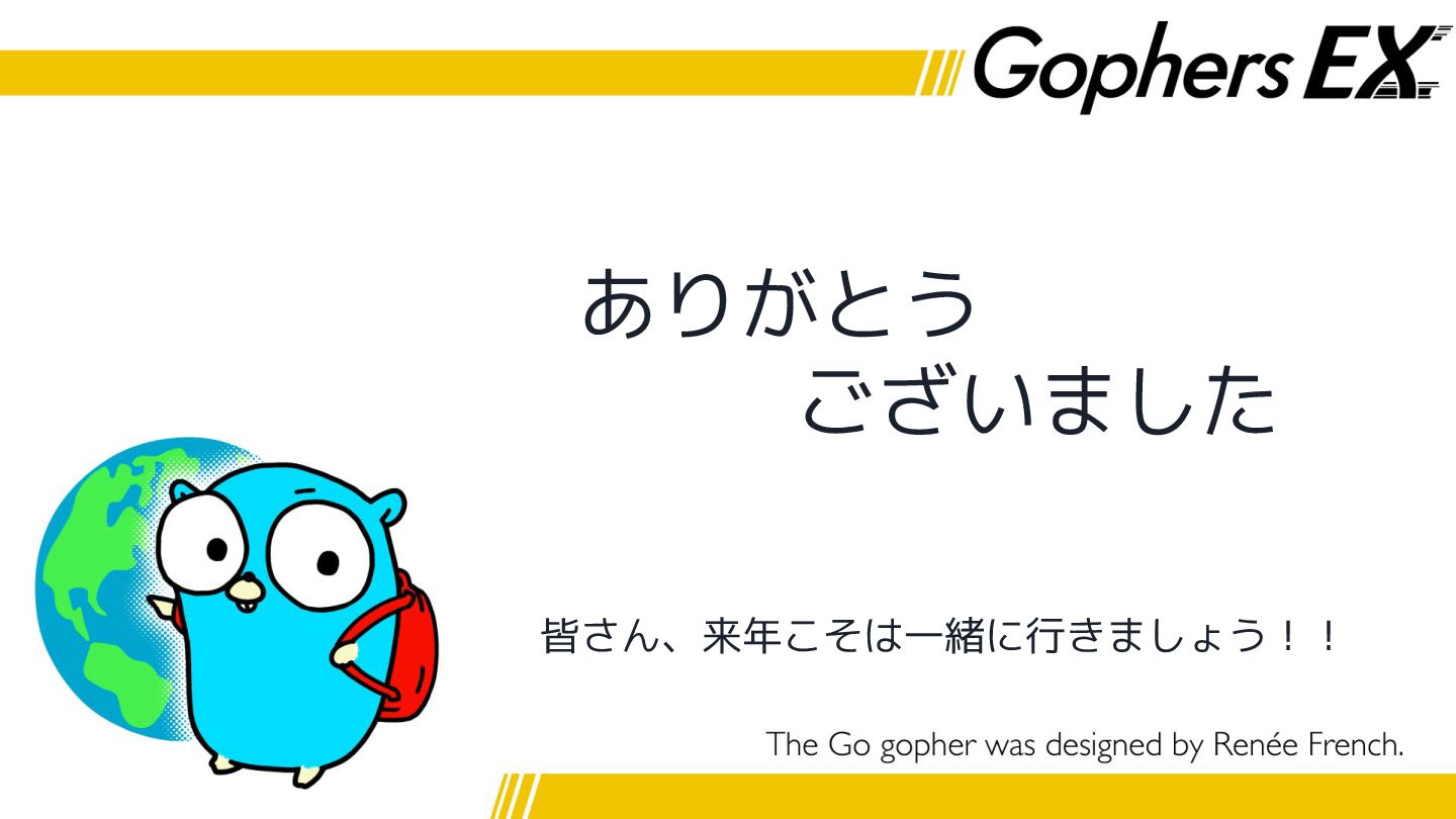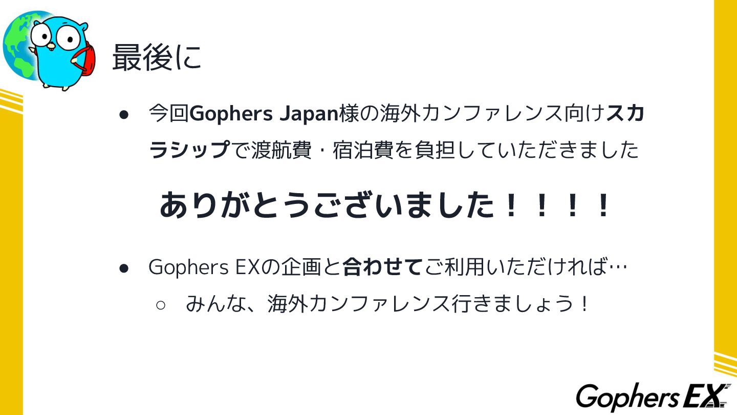 最後に • 今回Gophers Japan様の海外カンファレンス向けスカ ラシップで渡航費・宿泊費を負担していただきました ありがとうございました!!!! • Gophers EXの企画と合わせてご利用いただければ… ◦