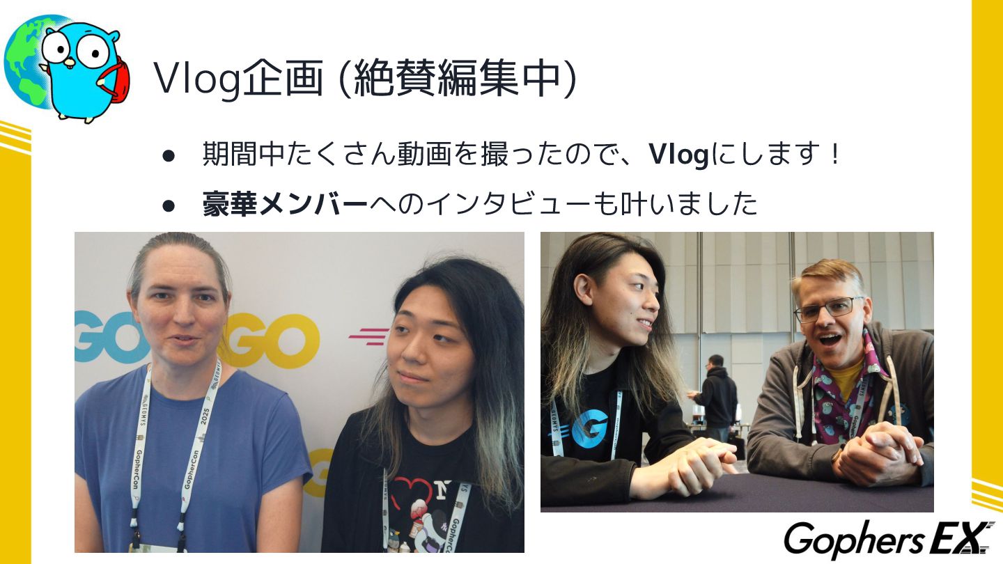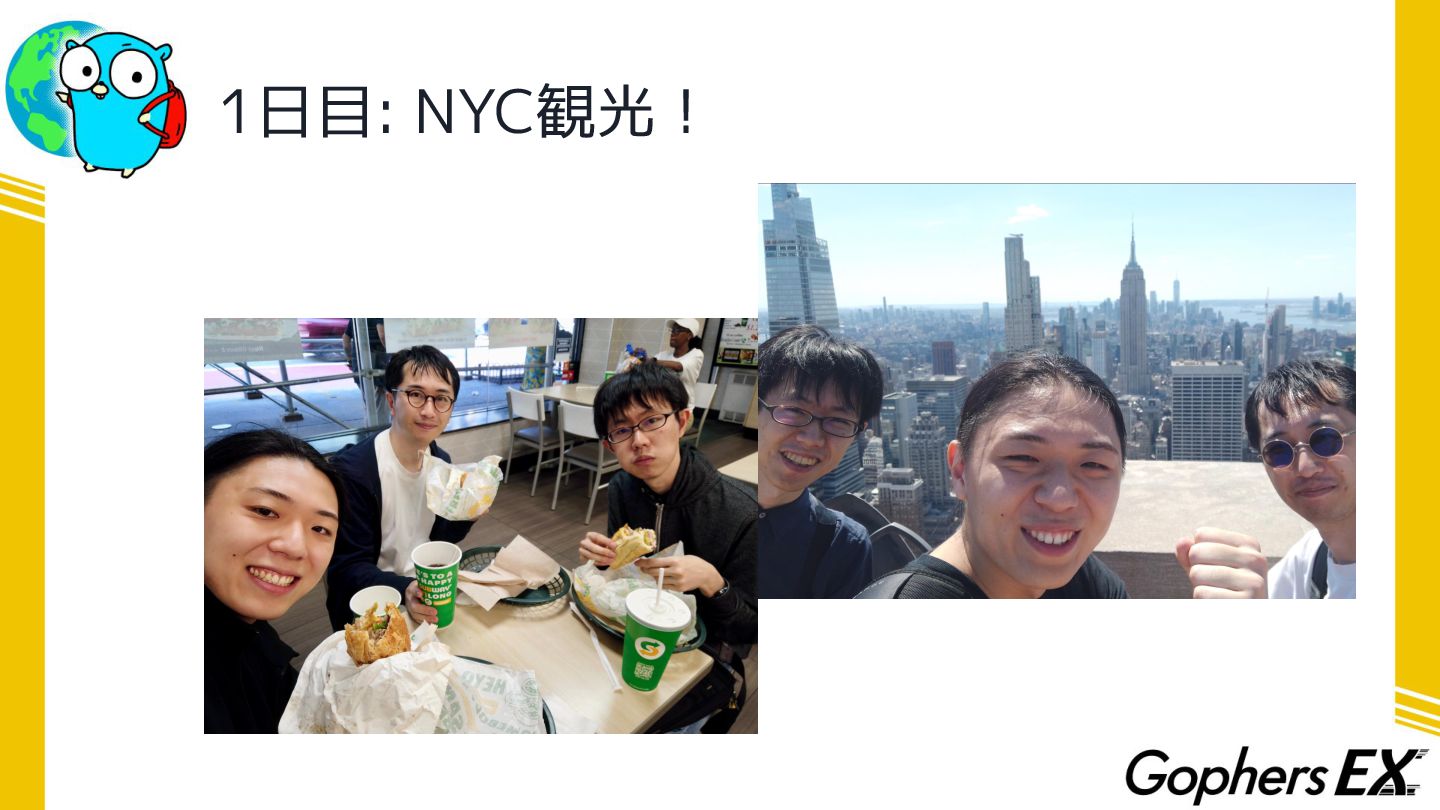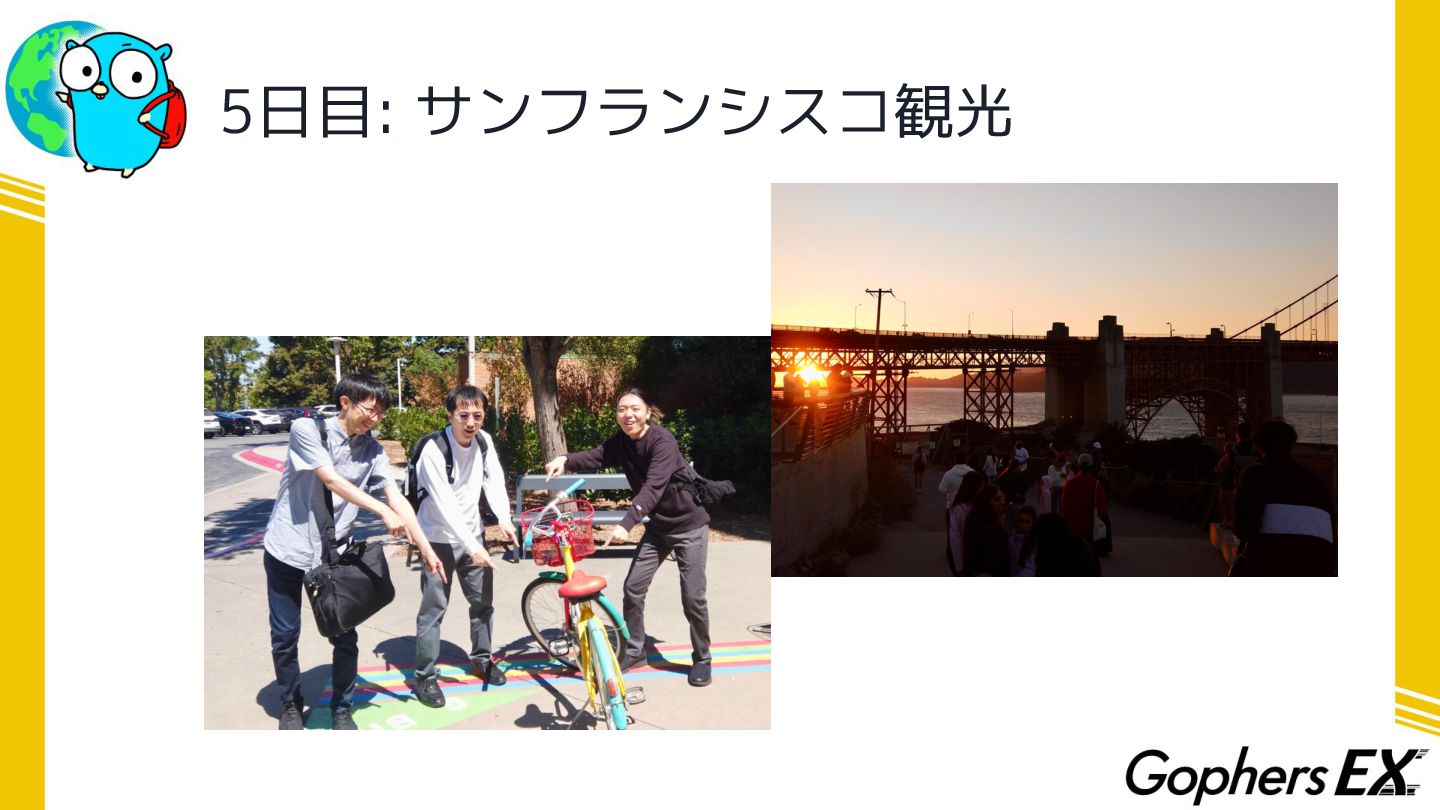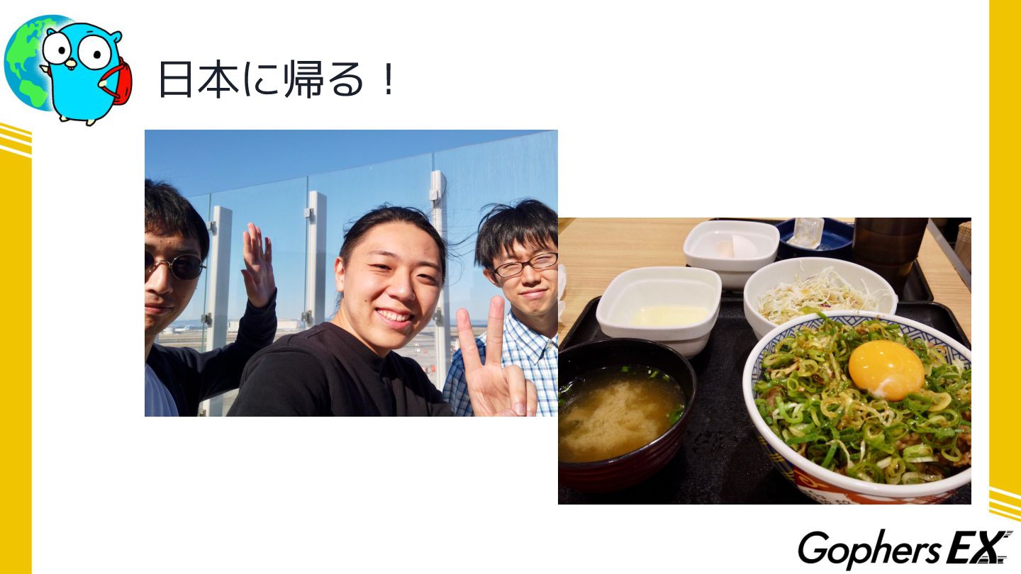 最後に • 今回Gophers Japan様の海外カンファレンス向けスカ ラシップで渡航費・宿泊費を負担していただきました ありがとうございました!!!! • Gophers EXの企画と合わせてご利用いただければ… ◦