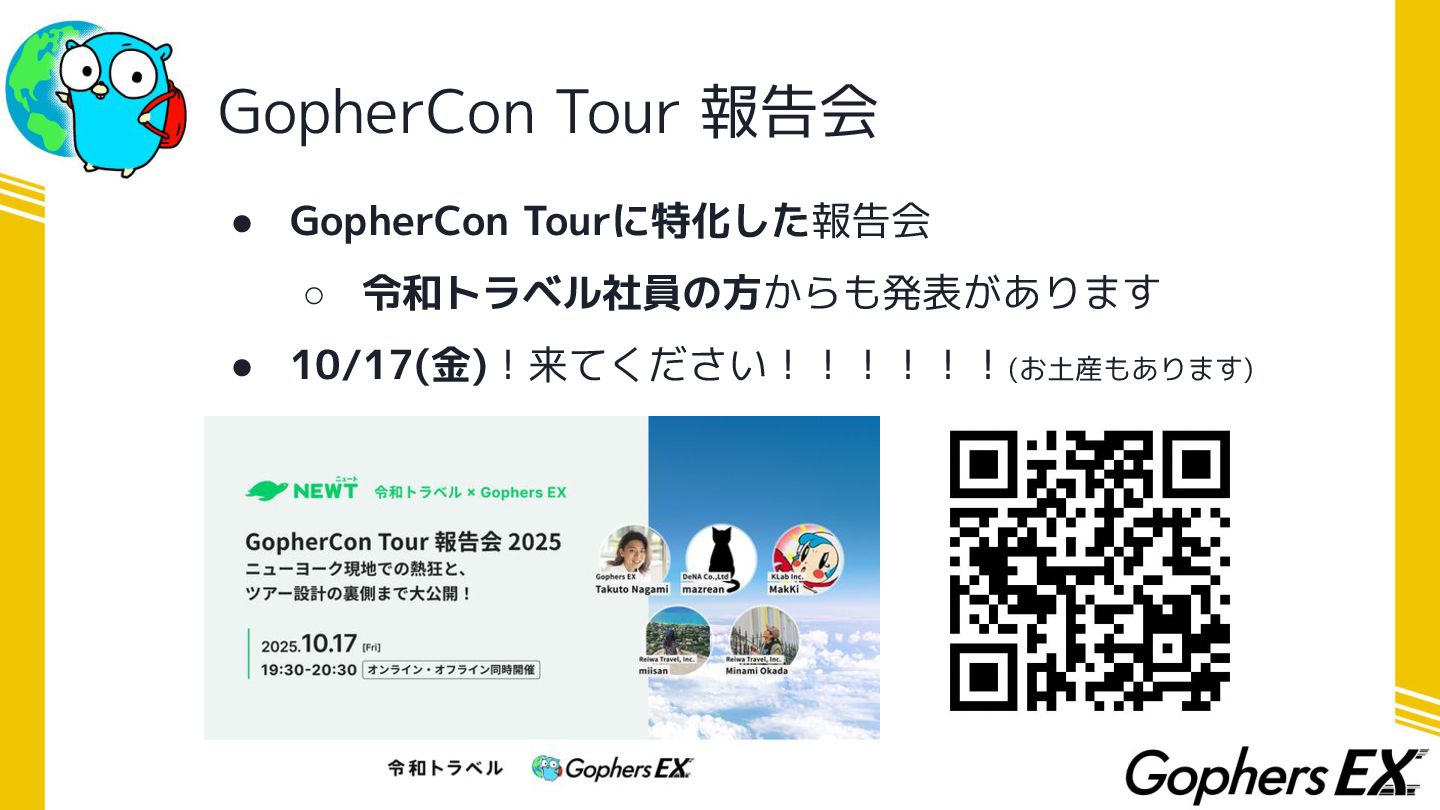 GopherCon Tour 報告会 • GopherCon Tourに特化した報告会 ◦ 令和トラベル社員の方からも発表があります • 10/17(金)!来てください!!!!!!(お土産もあります)